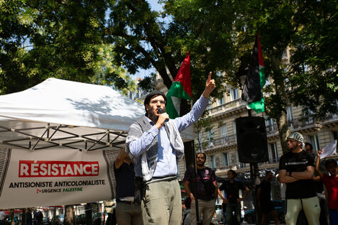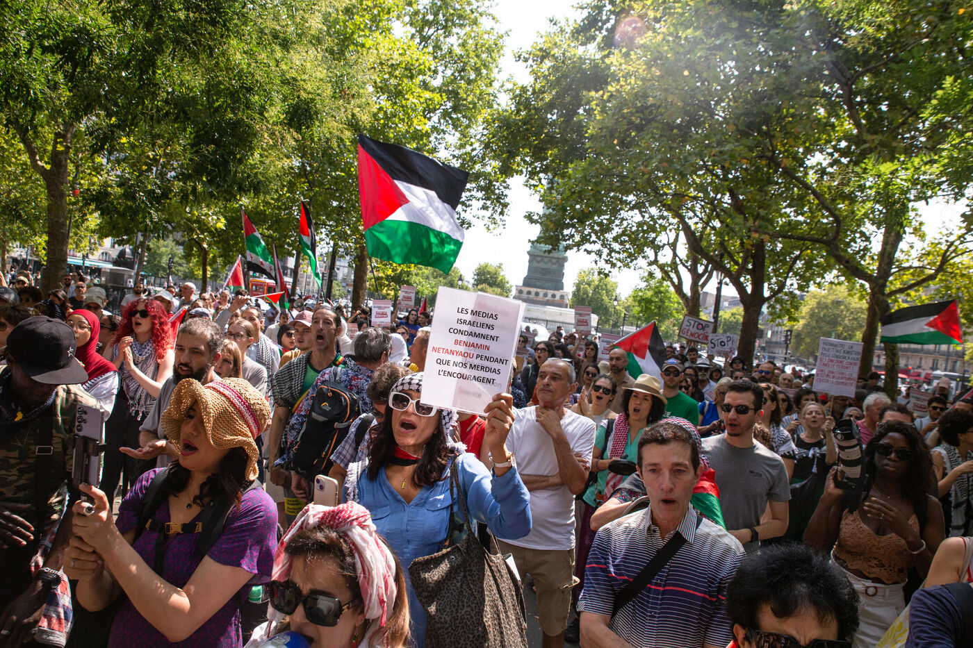 France, Paris, August 9, 2025. Rally for Palestine. Despite the summer truce, several hundred citizens continue to mobilize in solidarity with the Palestinian people. They are raising awareness about the ongoing genocide and famine in Gaza, calling for a ceasefire and sanctions against the Israeli regime.