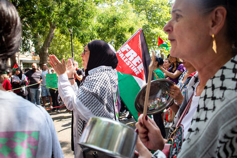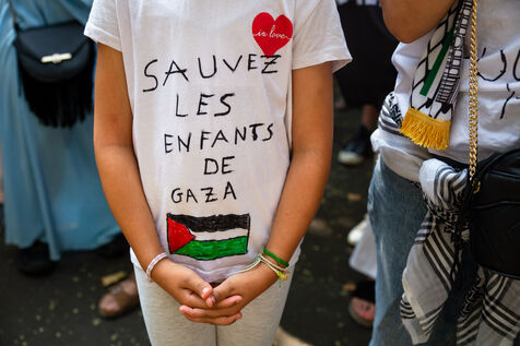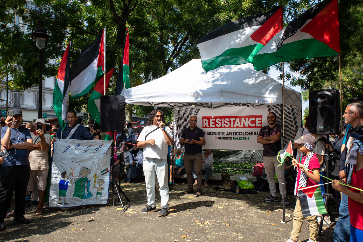 France, Paris, le 9 Aout 2025. Rassemblement pour la Palestine. Malgre la treve estivale, plusieurs centaines de citoyens continuent de se mobiliser en solidarite avec le peuple palestinien. Ils alertent sur le genocide et la famine en cours a Gaza, reclament un cessez-le-feu et des sanctions contre le regime israelien.