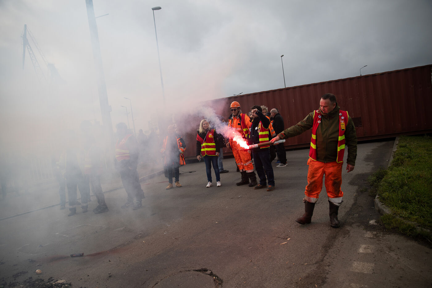 France, Brest, 2023-03-16. Opération port mort. Les syndicats maintiennent la pression sur le gouvernement en ce jour de vote de la réforme des retraites avec une action nationale de blocage des ports. Photographie de Vincent Feuray / Hans Lucas.