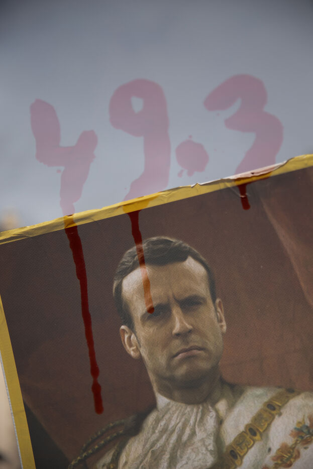 France, Kerlouan, 2023-03-17. Illustration. Double exposure of a portrait of Emmanuel Macron and a tag 49.3. Photograph by Vincent Feuray / Hans Lucas.