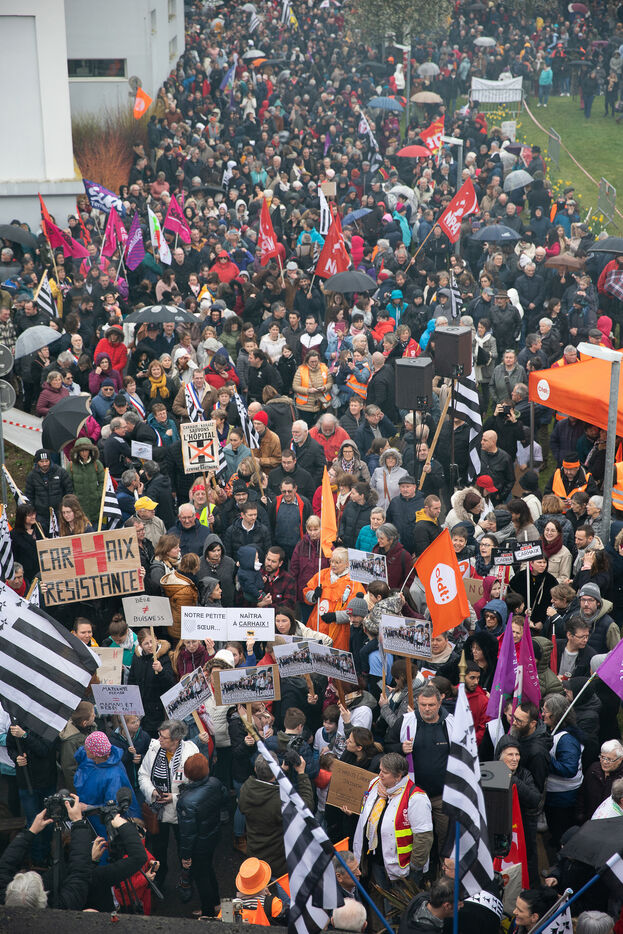 France, Carhaix, 2023-03-18. 5000 people demonstrate against the planned closure of the maternity hospital in Carhaix under the Rist law. Photograph by Vincent Feuray / Hans Lucas.