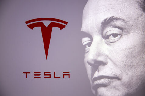 Double exposure illustration photographs of Elon Musk and his Tesla company logo.