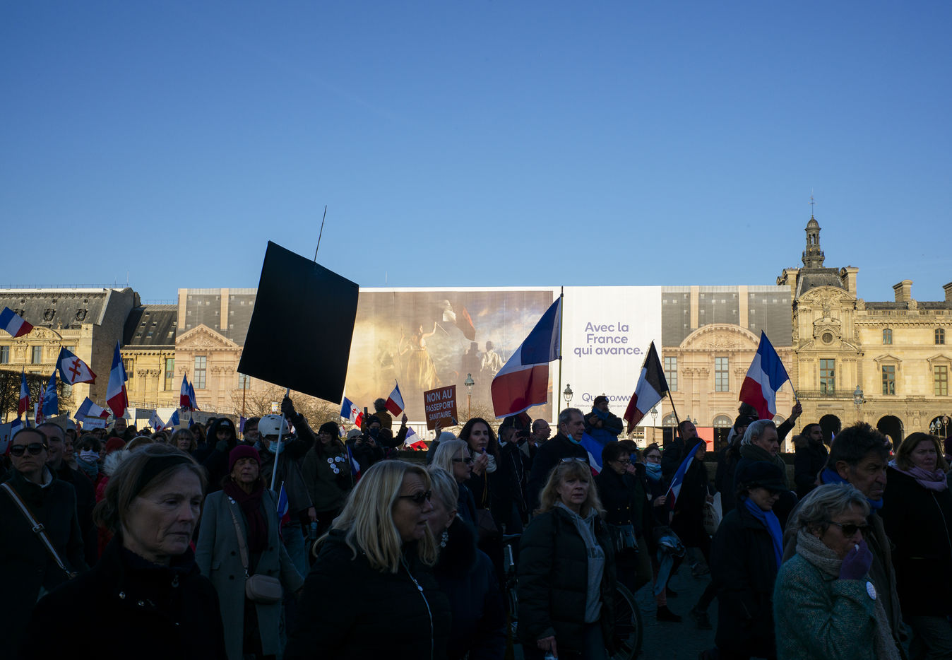 Quelques milliers d'opposants d'extrême droite ont manifesté samedi 18 decembre 2021, à Paris, contre le futur pass vaccinal et la troisième dose de vaccin obligatoire pour les soignants et les pompiers, à partir du 30 janvier 2022.