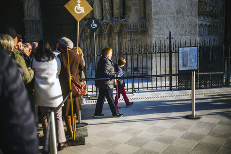 Devant la cathédrale, accessible au public depuis le 7 décembre dernier après plus de cinq de travaux, des visiteurs se pressent pour visiter l'intérieur restauré.