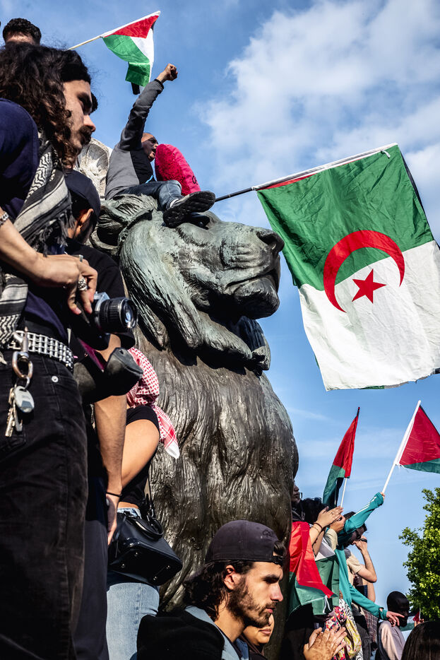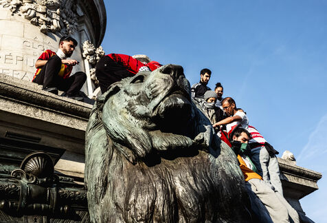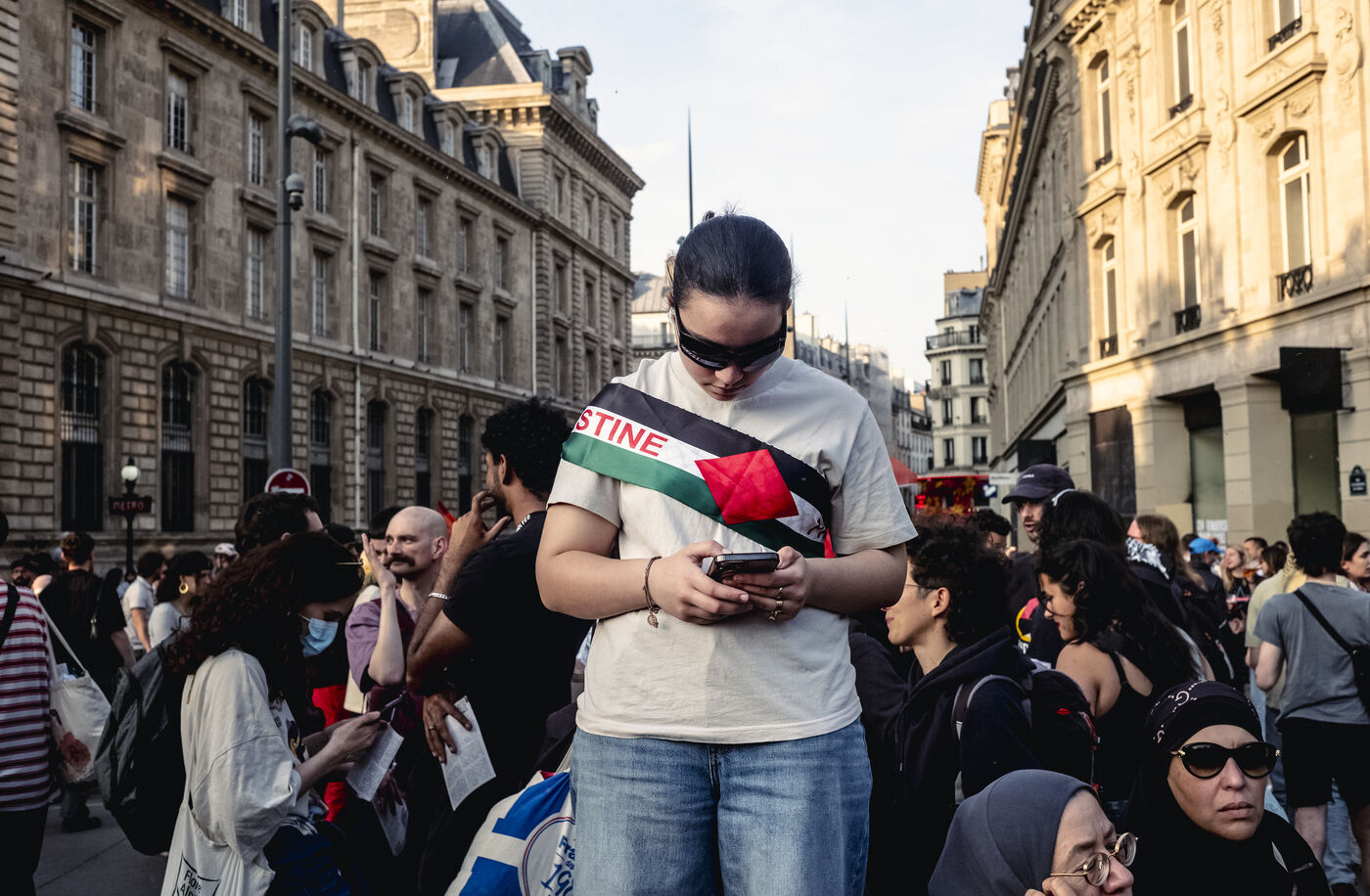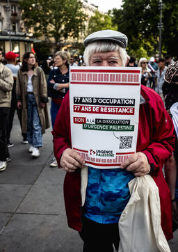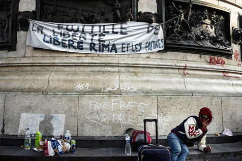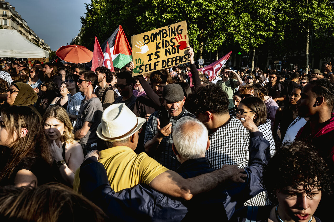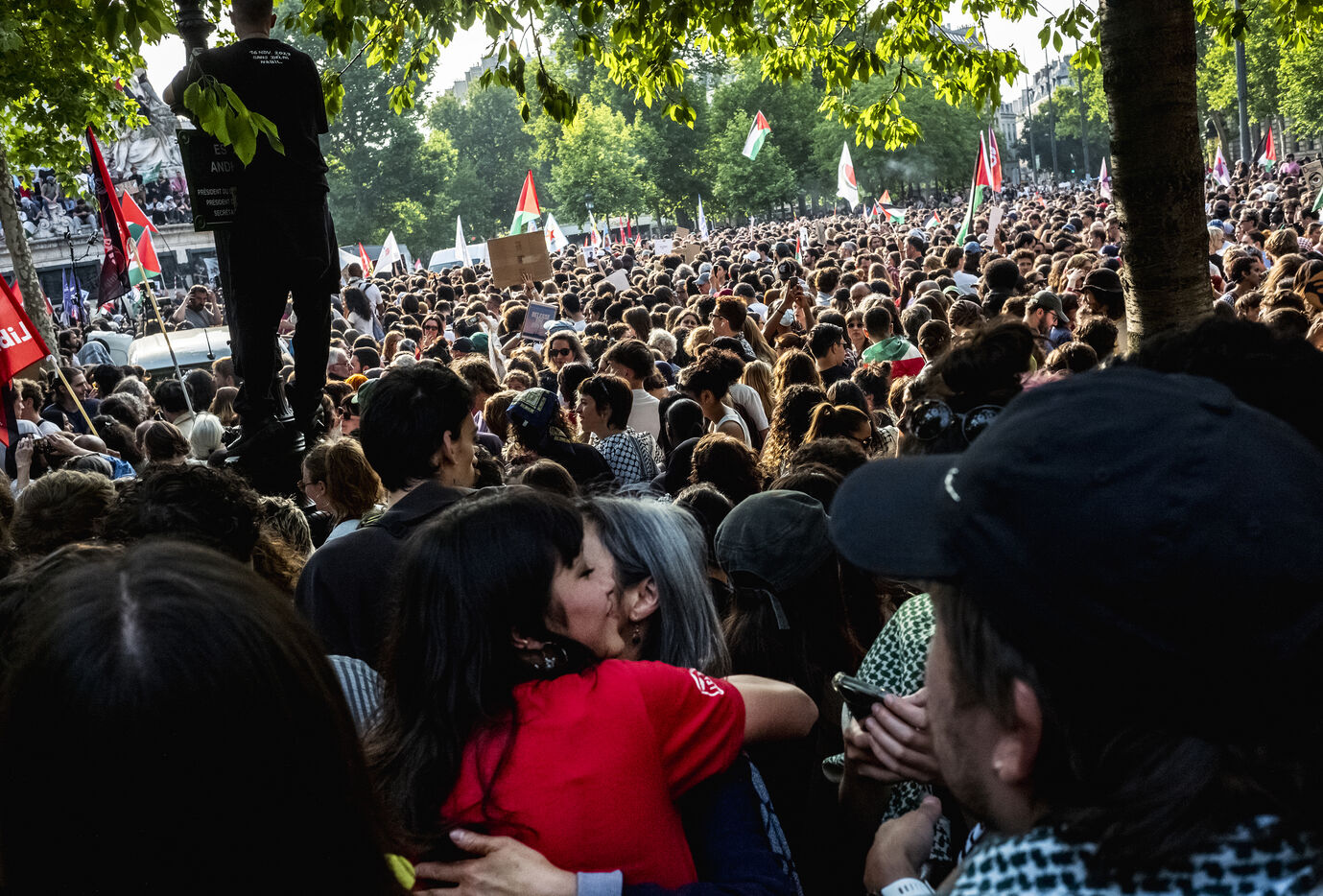 Des manifestants se sont rassemblés place de la République à Paris, les 9 et 10 juin 2025 en soutien à la Palestine, après l’interception par les autorités israéliennes de l'équipage du Madleen de la Flottille de la liberté pour Gaza.