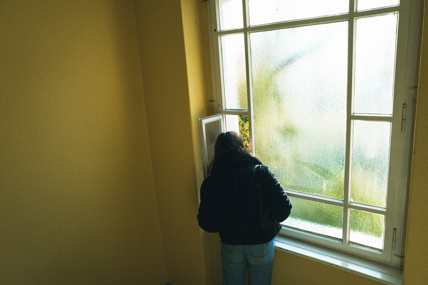 Trois photos d'une femme descendant dans une cage d'escalier aux tons jaunes et bleus à Berlin à l'automne 2021.