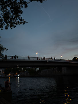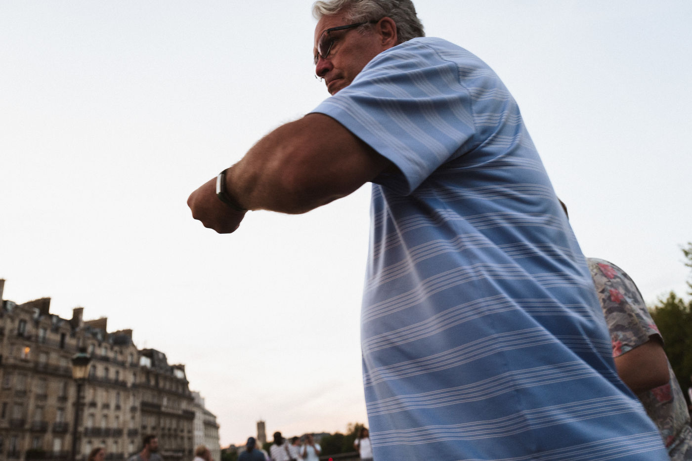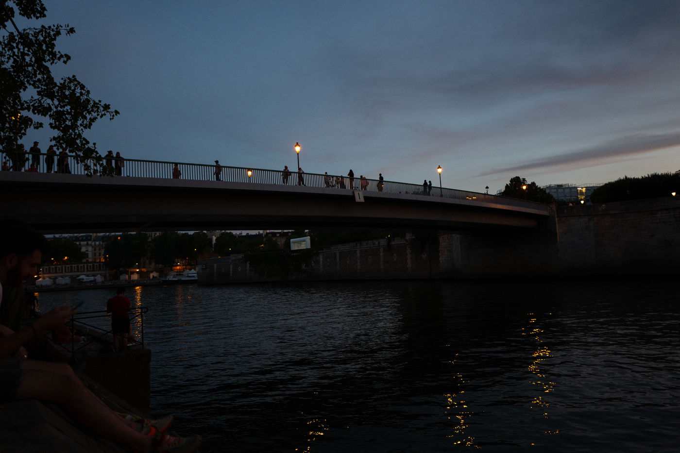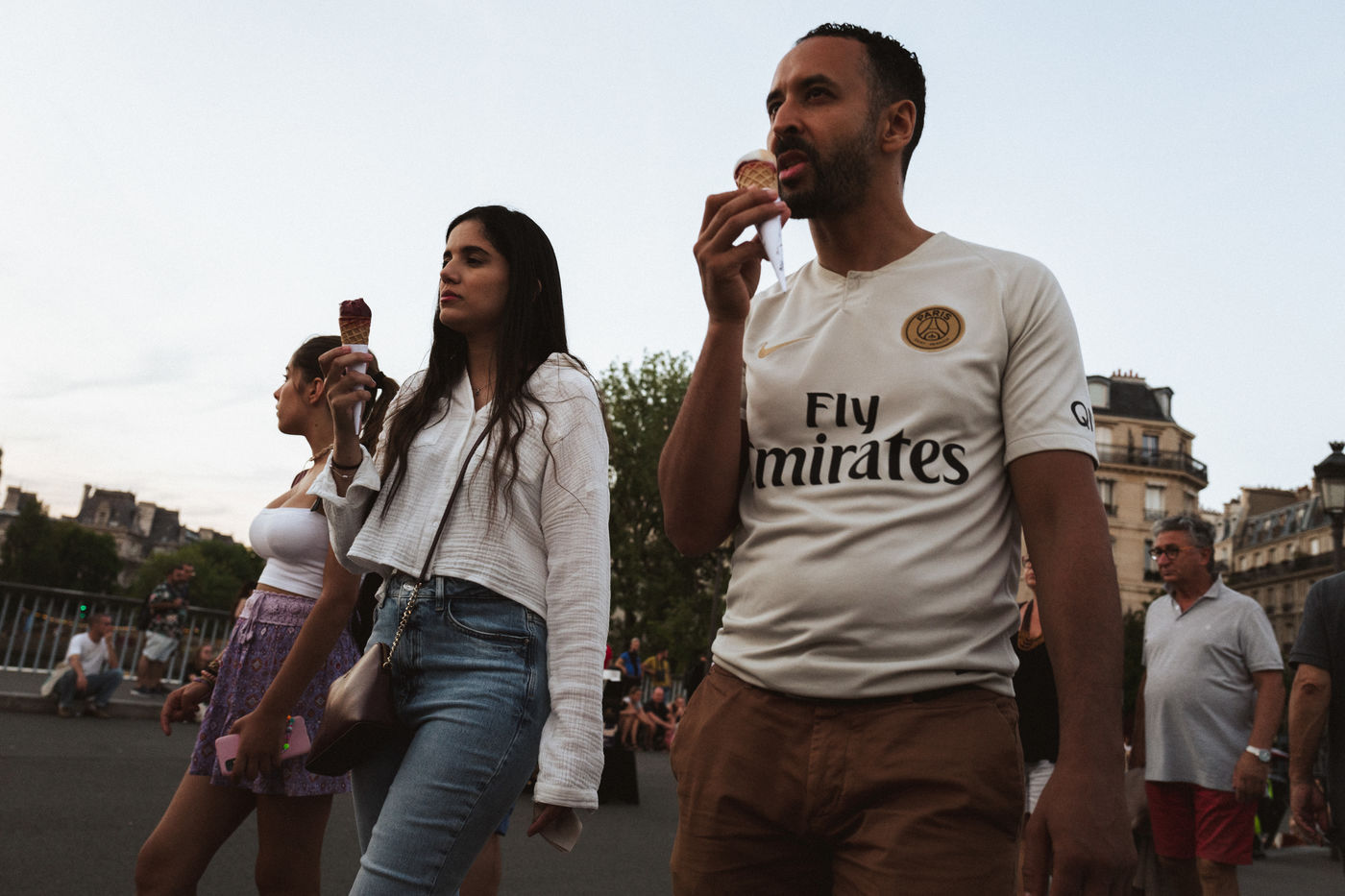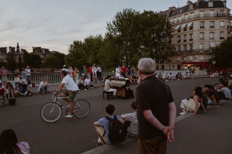 La scène se passe autour d'un homme jouant du piano sur le Pont Saint-Louis à Paris durant l'été 2023. De nombreuses s'arrêtent le temps de regarder le spectacle sous un coucher de soleil magnifique. L'ambiance est typique des soirs d'été parisiens. Une vie sur les quais et les ponts de la Seine.