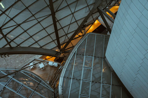 Different views of the Louis Vuitton Foundation in Paris at the end of the day.