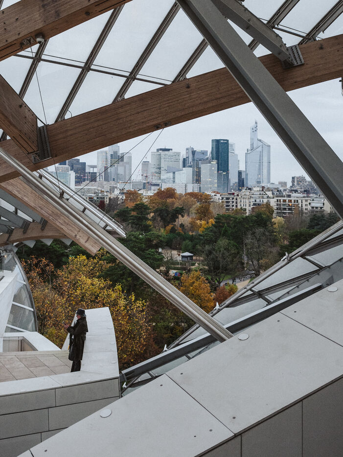 Différentes vues de la fondation Louis Vuitton à Paris en fin de journée.