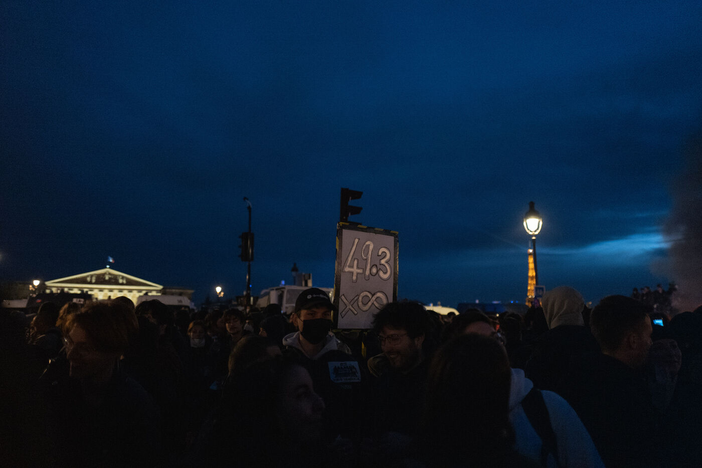 Des milliers de manifestants se sont réunis place de la Concorde à Paris, où de nombreuses forces de l'ordre étaient présents. La manifestation s'est dispersée et poursuivie dans les rues alentours. Des barricades ont été dressées et des déchets présents en nombre à cause de la grève des éboueurs contre la réforme des retraites ont été brulés.