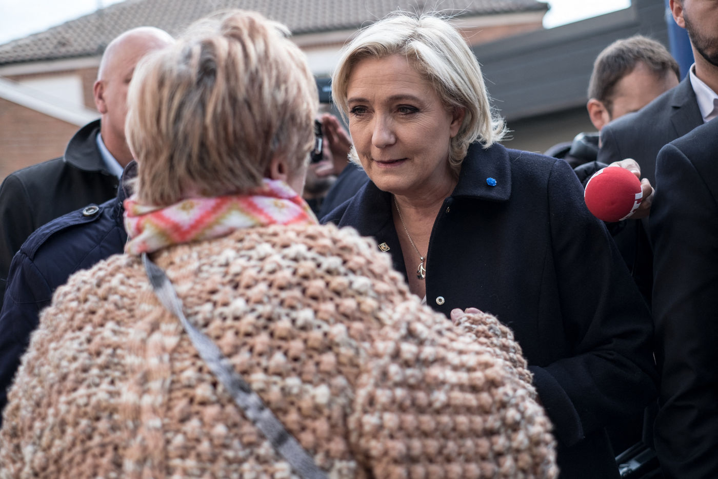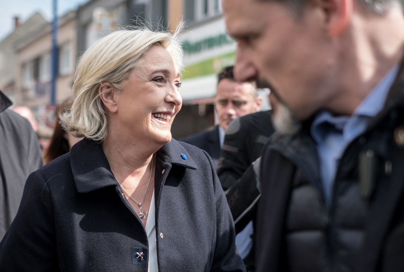 1ère sortie de Marine Le Pen au lendemain du 1er tour de l'élection présidentielle sur le marché de Rouvroy dans le Pas-de-Calais.
