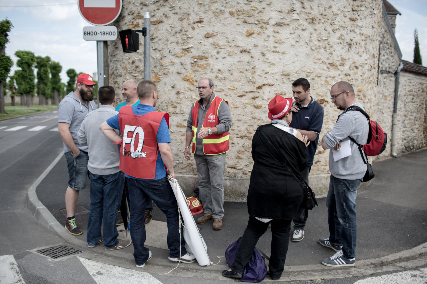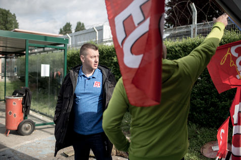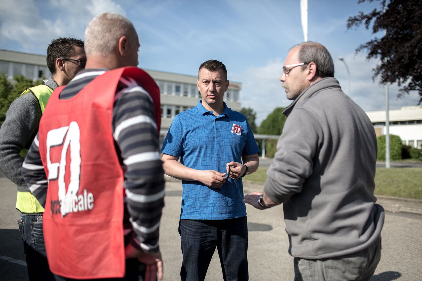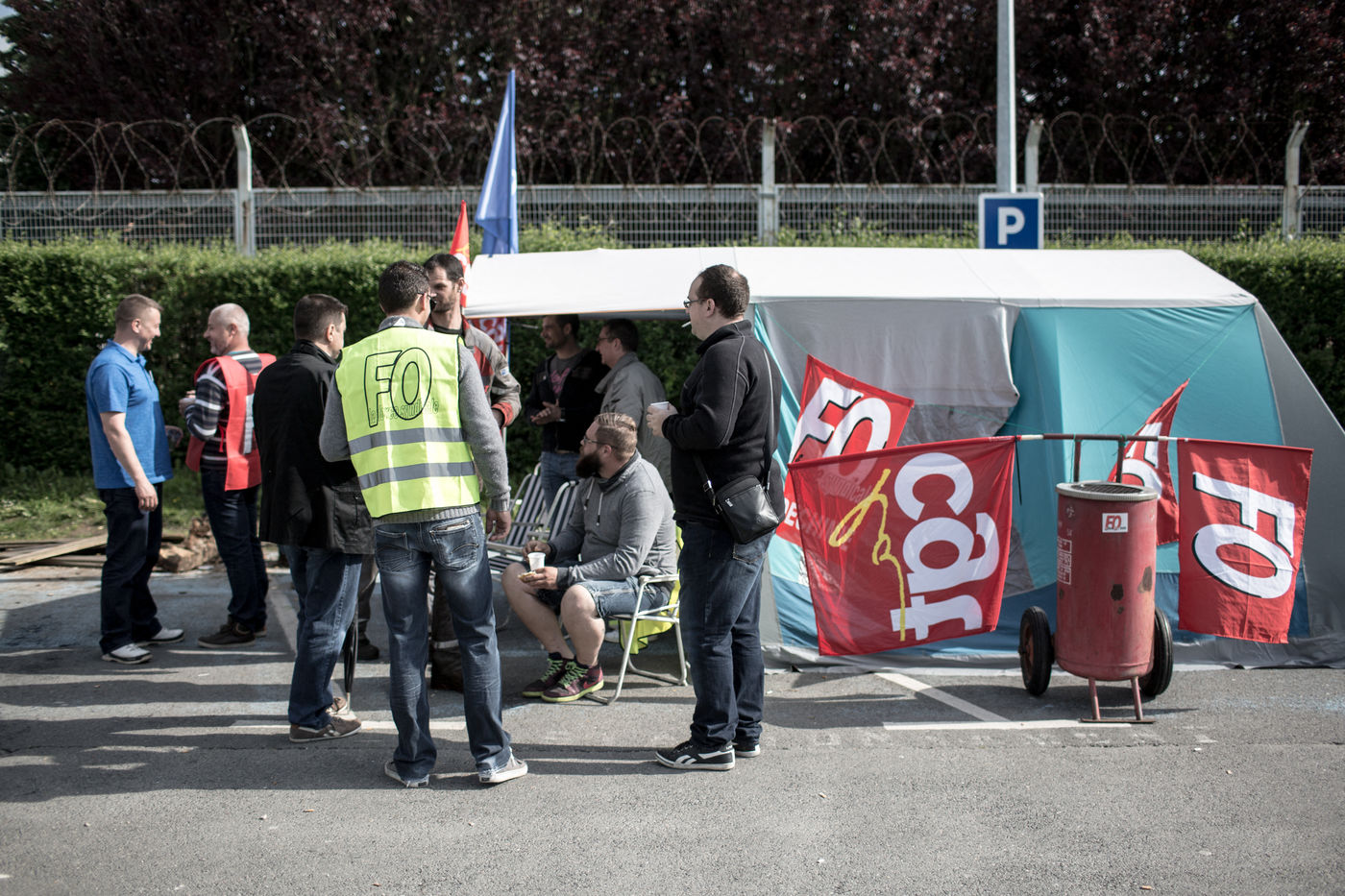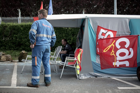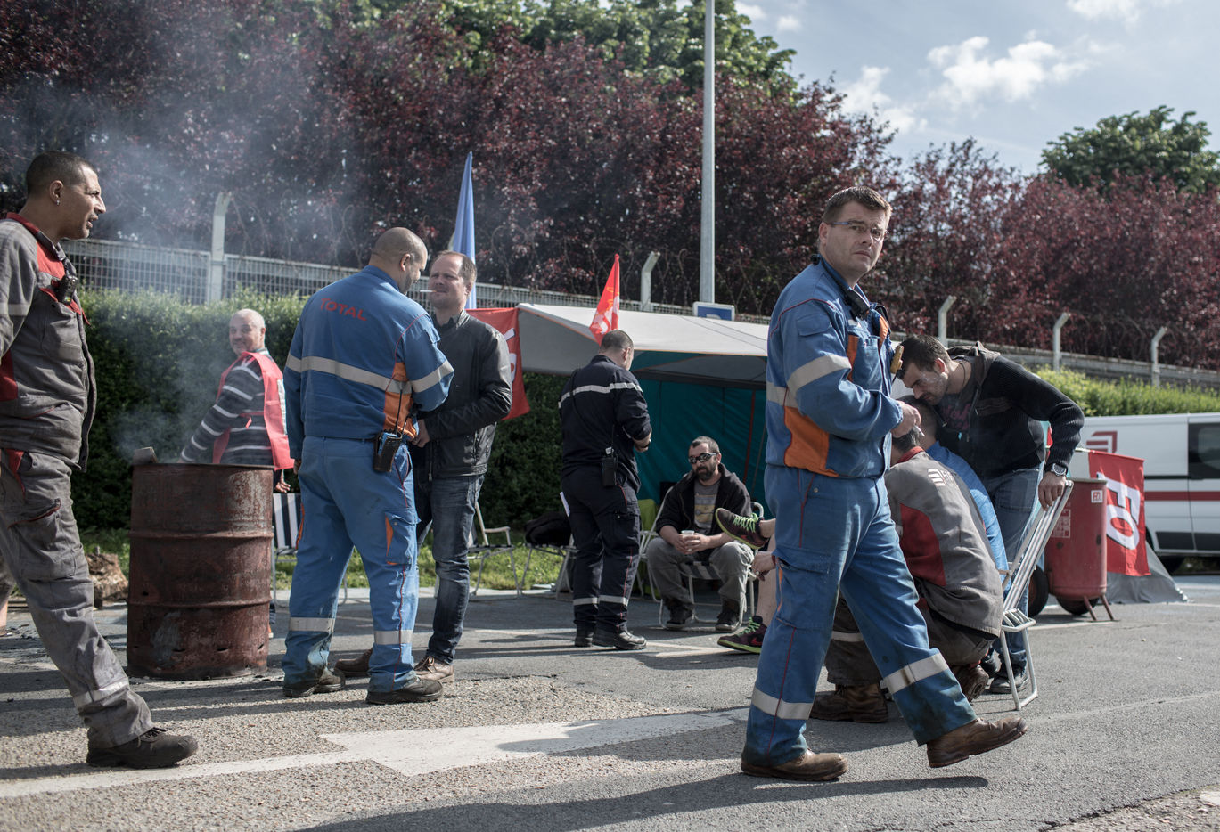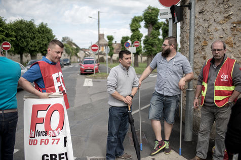 Depuis une semaine, les ouvriers de la raffinerie Total de Grandpuits en Seine-et-Marne ont voté à 60 % la grève pour protester contre le projet de loi travail. Les deux principaux syndicats FO et CGT insiste sur le fait que leur site n'est pas bloqué. La grève d'une majorité de salariés de l'entreprise a mécaniquement provoqué l'arrêt de la production. Ce jeudi 26 mai 2016, le piquet de grève est installé devant l'usine depuis la veille. Un groupe de grévistes s'y relaient. Parmi eux, le responsable de FO, Franck Bobard. Ce père de famille n'est pas un militant aguéri de longue date. Il travaille chez Total depuis seulement 5 ans et est investi dans le syndicat depuis 4 ans. Avant, il travaillait dans de petites PME. Son engagement comme celui de ses camardes contre la loi travail est fortement motivé par la dureté du travail qu'il doit accomplir à la raffinerie. Pour lui, cette loi ne ferait que dégrader ses conditions de travail. Avec quelques grévistes Franck rejoint un car affrété par FO pour aller à la manifestation à Paris. Leur cortège est situé loin de la tête de la manifestation, loin des incidents qui ont émaillé une nouvelle fois ce défilé. Lui-même ne se reconnait pas dans ces actes de violence.