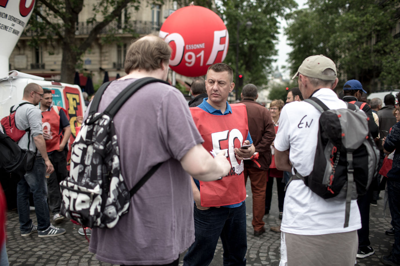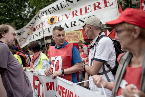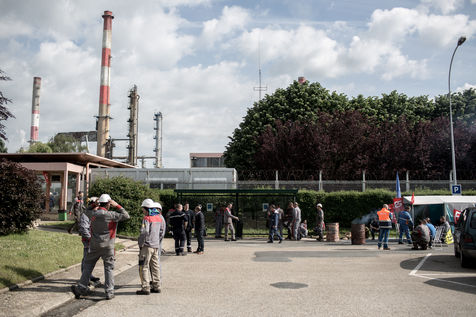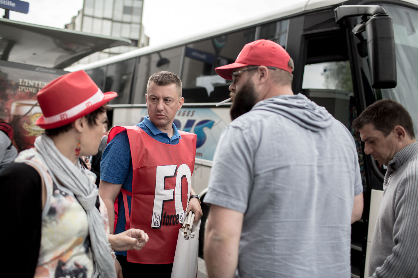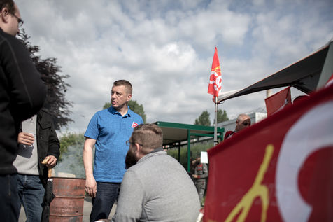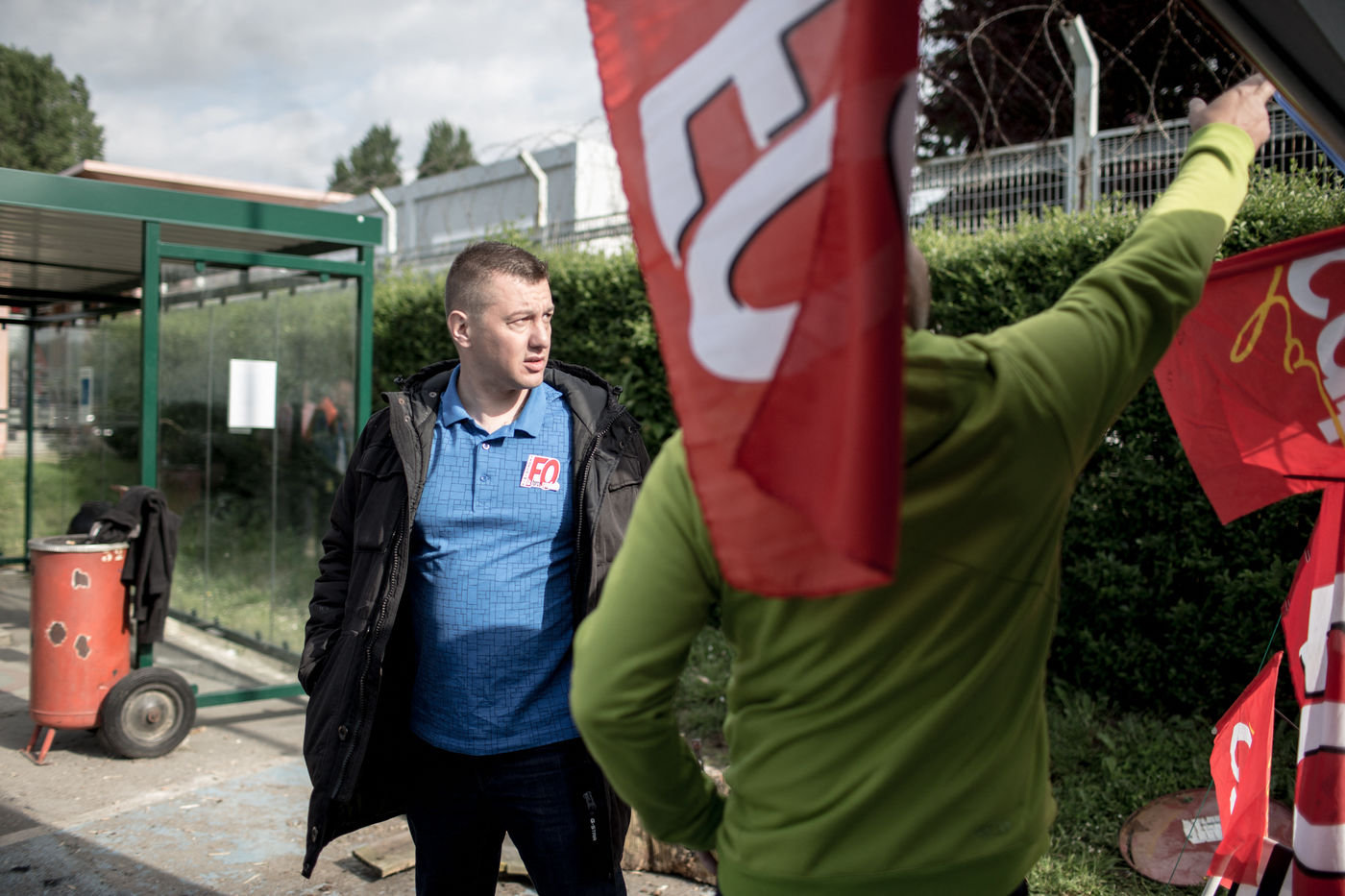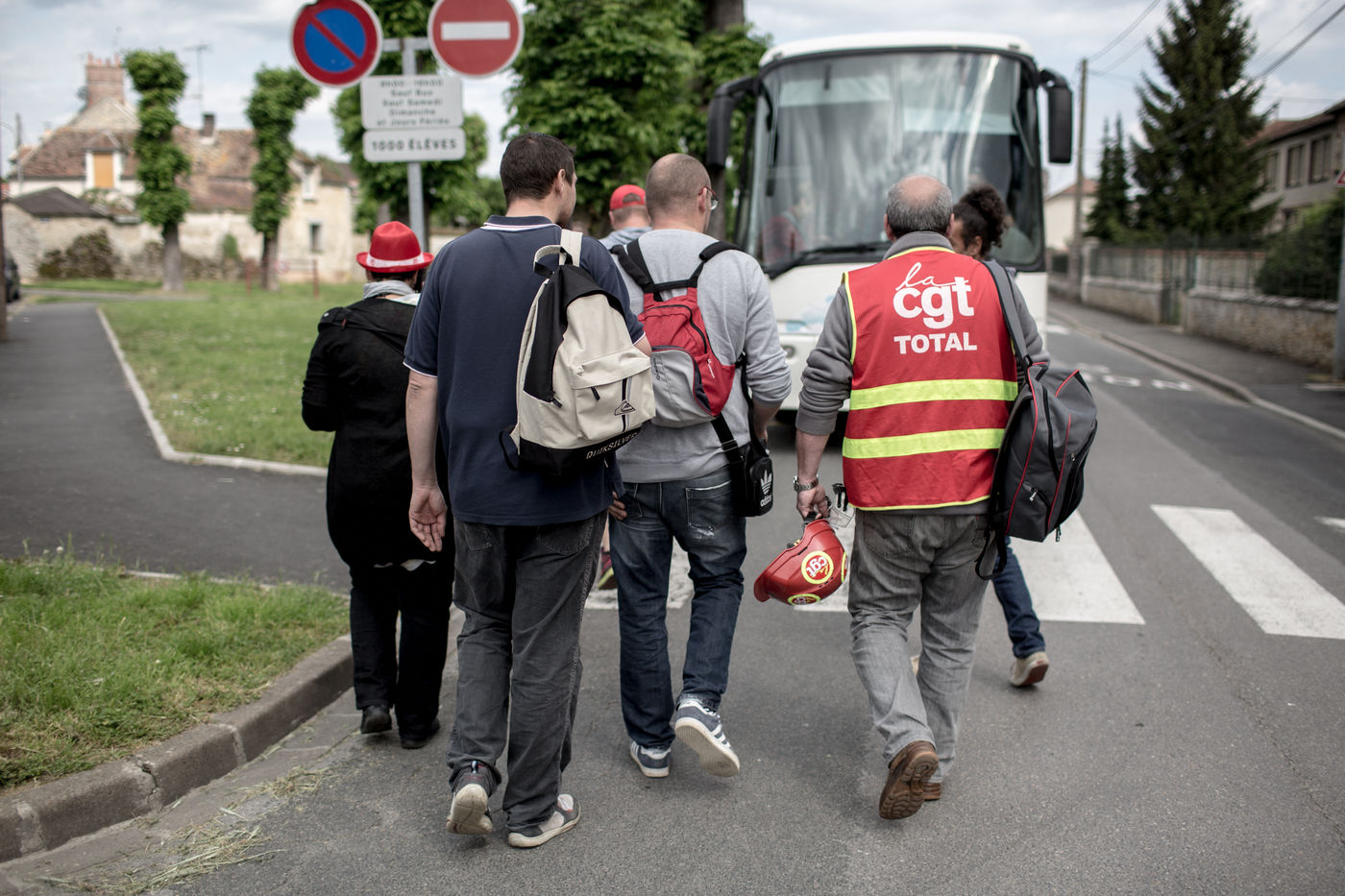 Depuis une semaine, les ouvriers de la raffinerie Total de Grandpuits en Seine-et-Marne ont voté à 60 % la grève pour protester contre le projet de loi travail. Les deux principaux syndicats FO et CGT insiste sur le fait que leur site n'est pas bloqué. La grève d'une majorité de salariés de l'entreprise a mécaniquement provoqué l'arrêt de la production. Ce jeudi 26 mai 2016, le piquet de grève est installé devant l'usine depuis la veille. Un groupe de grévistes s'y relaient. Parmi eux, le responsable de FO, Franck Bobard. Ce père de famille n'est pas un militant aguéri de longue date. Il travaille chez Total depuis seulement 5 ans et est investi dans le syndicat depuis 4 ans. Avant, il travaillait dans de petites PME. Son engagement comme celui de ses camardes contre la loi travail est fortement motivé par la dureté du travail qu'il doit accomplir à la raffinerie. Pour lui, cette loi ne ferait que dégrader ses conditions de travail. Avec quelques grévistes Franck rejoint un car affrété par FO pour aller à la manifestation à Paris. Leur cortège est situé loin de la tête de la manifestation, loin des incidents qui ont émaillé une nouvelle fois ce défilé. Lui-même ne se reconnait pas dans ces actes de violence.