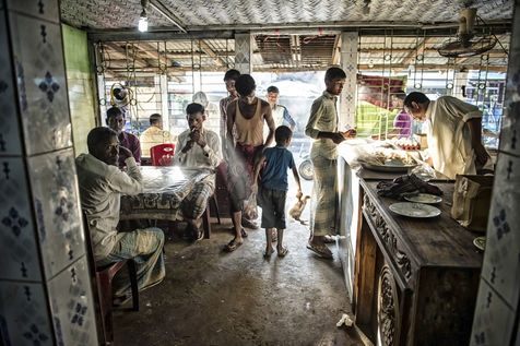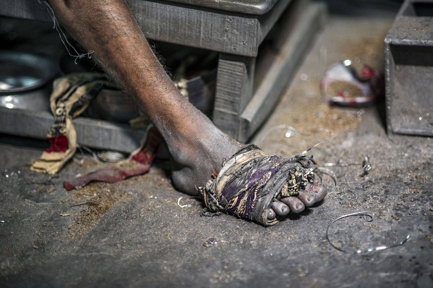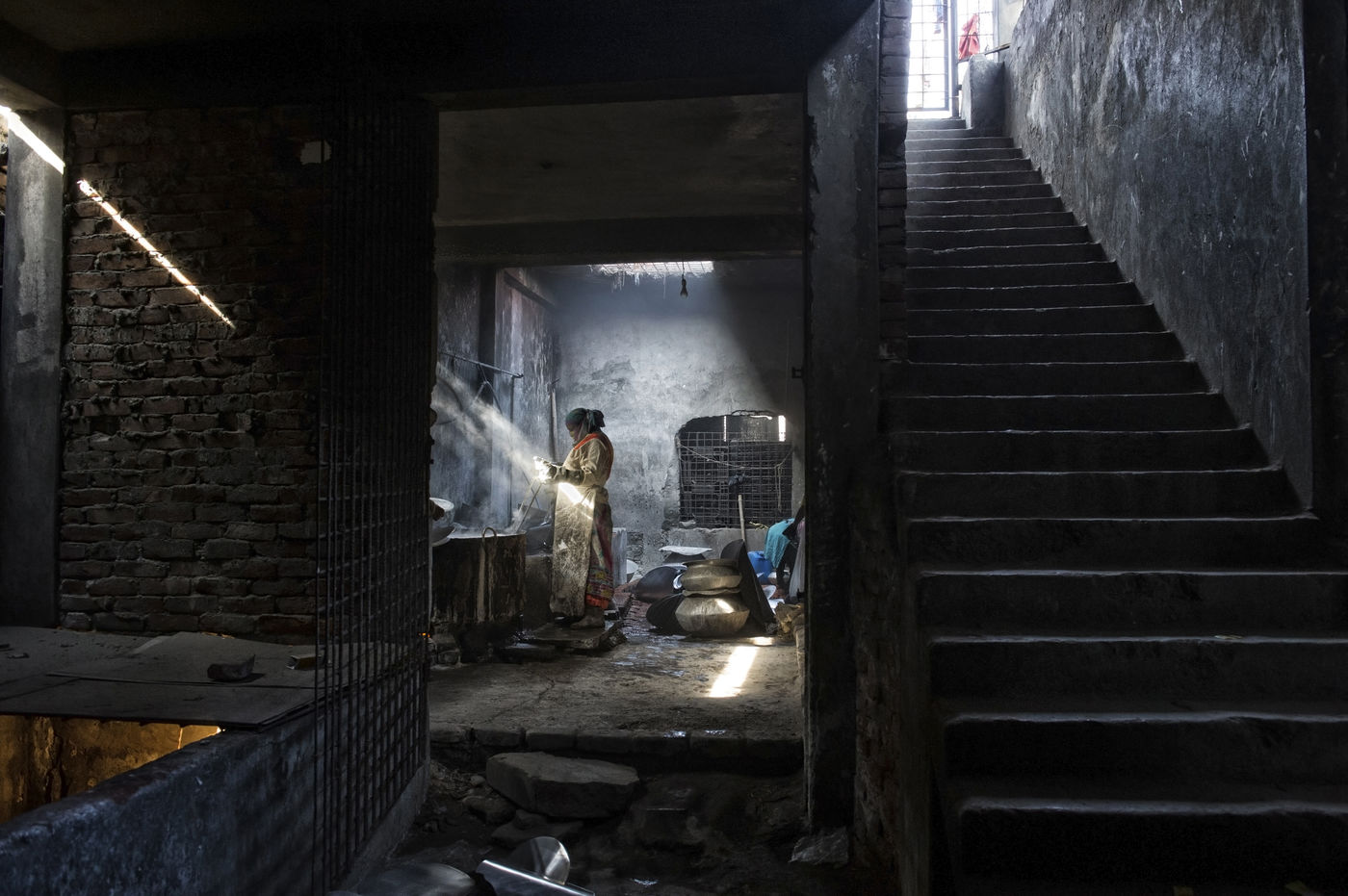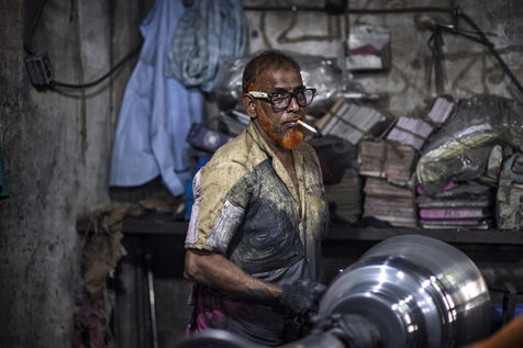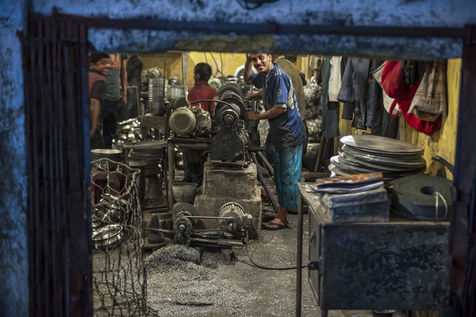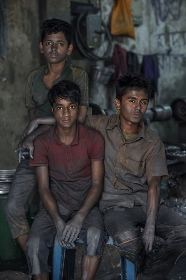 There are many aluminium factories in Bangladesh where different types of pots and pans are made from recycled and melted aluminium. To produce an aluminium pan, bowl, kettle or kettle, this aluminium must first be melted, transformed into ingots, rolled and then cut into discs. Then comes anodizing, a chemical process to prevent objects from rusting. The aluminium discs are dipped in sulphuric acid and then caustic soda. The work is dangerous and toxic. The discs are then formed with the force of the arms on rotating machines to obtain the kitchen utensils. The final touch is the sandpaper polishing that you attach to your hands and feet.