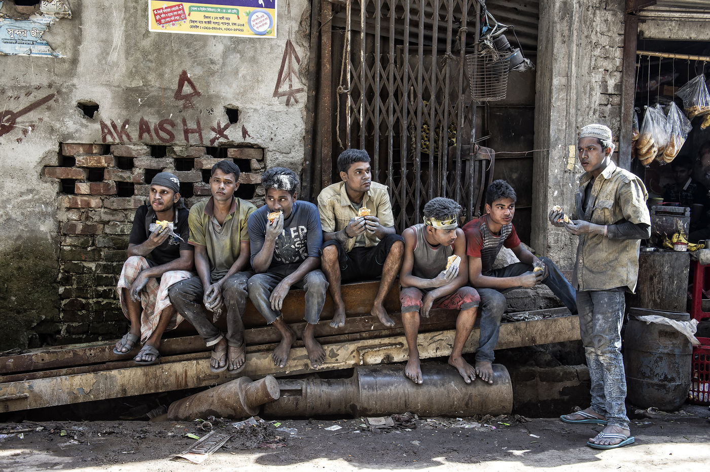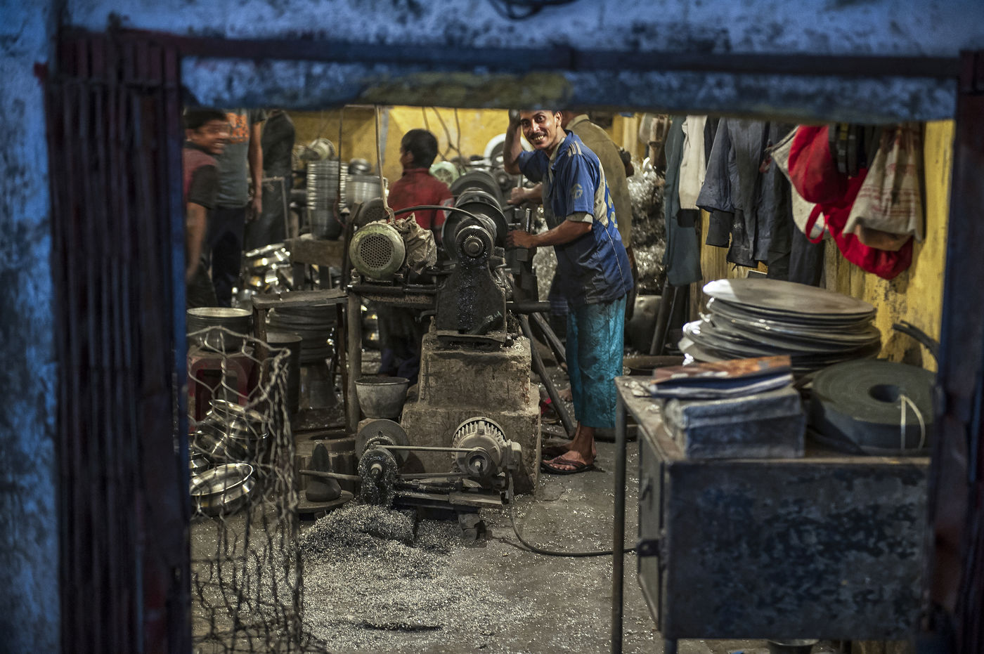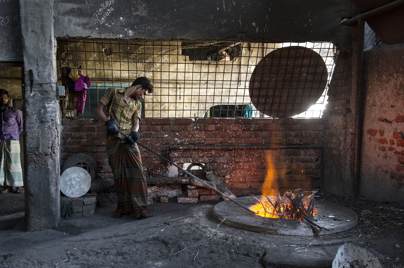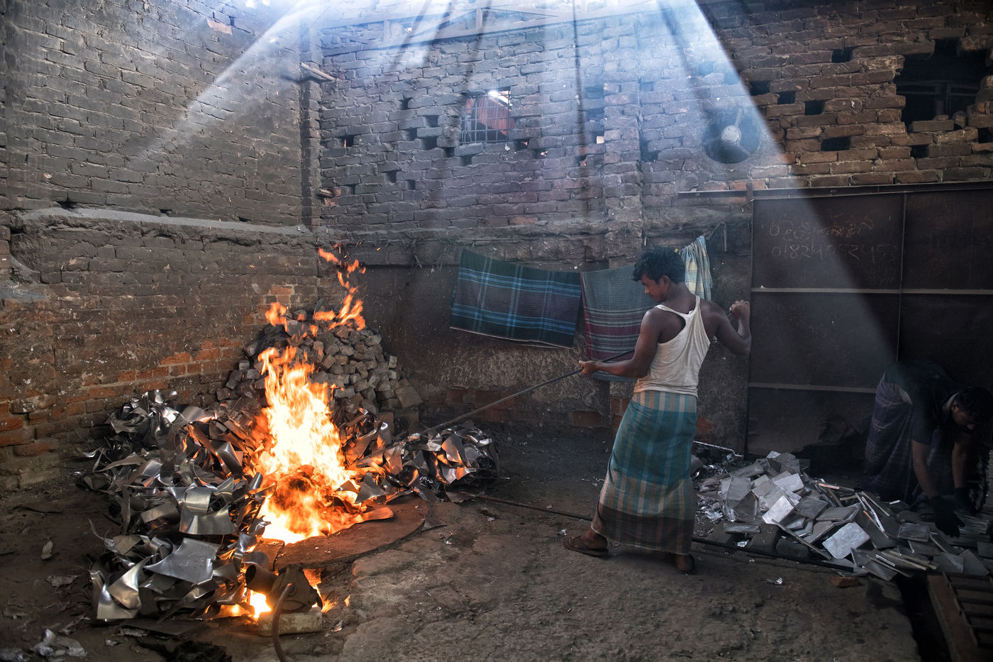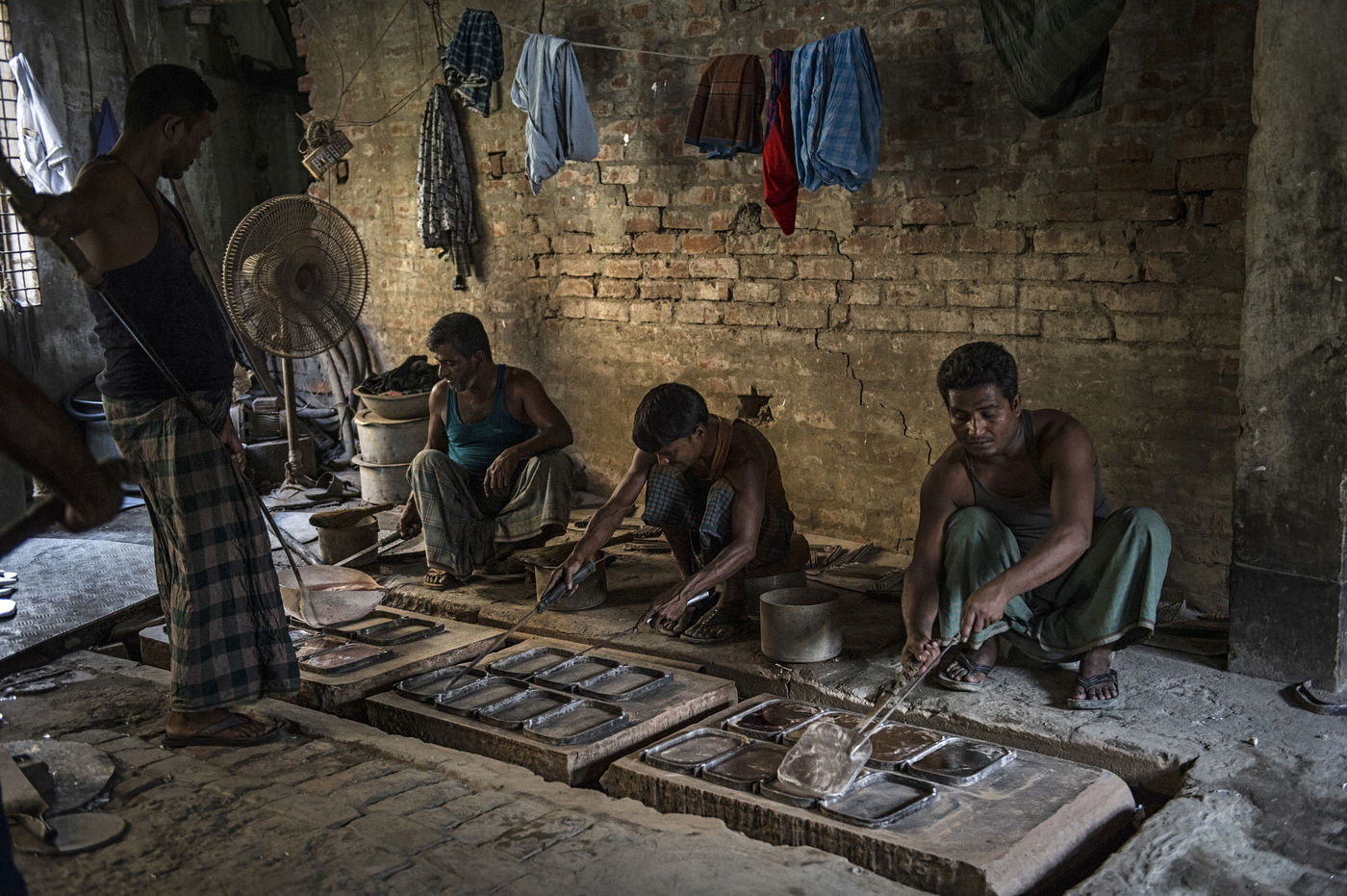Les fabriques d'aluminium sont nombreuses au Bangladesh où différents types de pots et de marmites sont fabriqués à partir d'aluminium recyclé et fondu. Pour produire une casserole, un bol, une marmite ou une bouilloire en aluminium on doit tout d'abord fondre cet aluminium, le transformer en lingots, le laminer puis le découper en disques. Vient ensuite, l'anodisation, un procédé chimique afin d'éviter que les objets ne rouillent. On trempe les disques d'aluminium dans de l'acide sulfurique puis dans de la soude caustique. Le travail est dangereux et toxique. Les disques sont ensuite formés à la force des bras sur des machines rotatives pour obtenir les ustensiles de cuisine. La touche finale est le polissage au papier de verre que l'on fixe sur ses mains et sur ses pieds.
