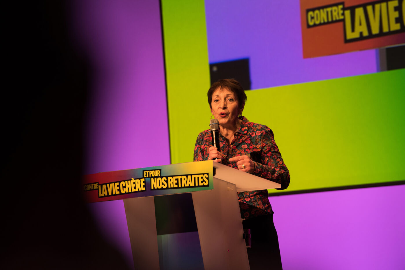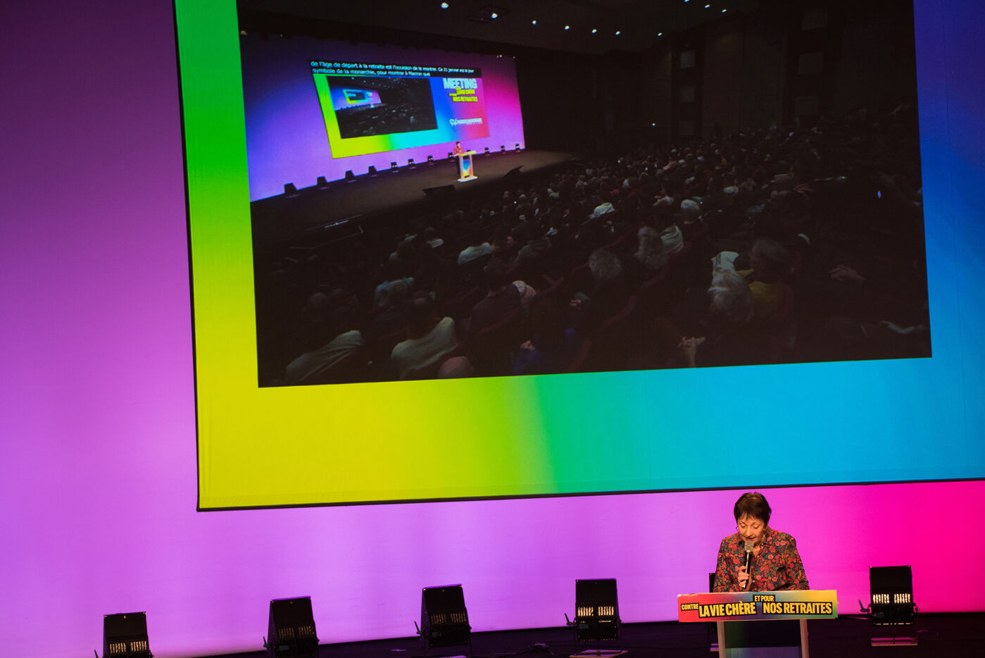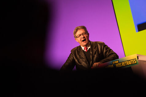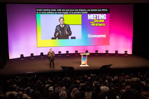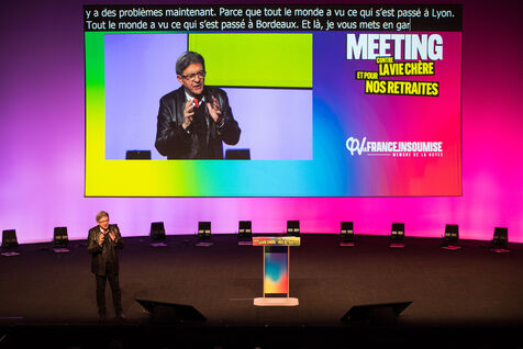 Le 16 décembre 2022, au Centre de Congrès de Saint-Etienne, Jean-Luc Mélenchon et la députée ligérienne Andrée Taurinya, sont en meeting contre la vie chère.