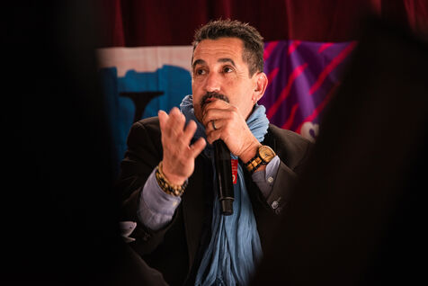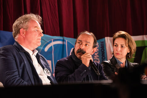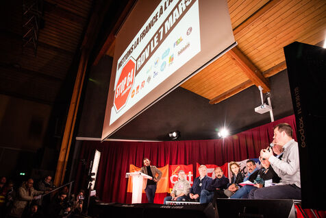 Environ un millier de personnes se sont retrouvées le jeudi 2 mars 2023 à la Ricamarie, dans le departement de la Loire, pour un grand débat public contre le projet de réforme des retraites du Gouvernement. Les principaux leaders syndicaux français ont répondu à l'appel.