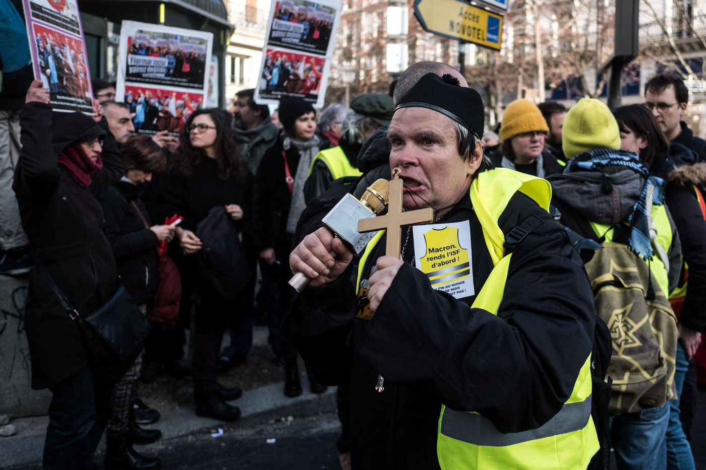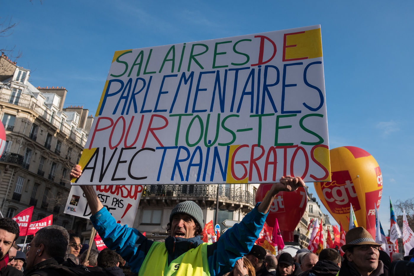 Manifestation de "Grève générale" interprofessionnelle à l'appel des syndicats CGT, Sud Solidaires et de Gilets Jaunes pour la justice sociale et le pouvoir d'achat. Cette manifestation a réunie pour la première fois, syndicats, Gilets Jaunes, étudiants, lycéens et anarchistes autonomes.