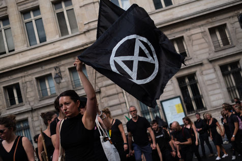Action pacifiste du groupe Extinction Rébellion à Paris, en réaction aux incendies en Amazonie et à l'inaction des états.