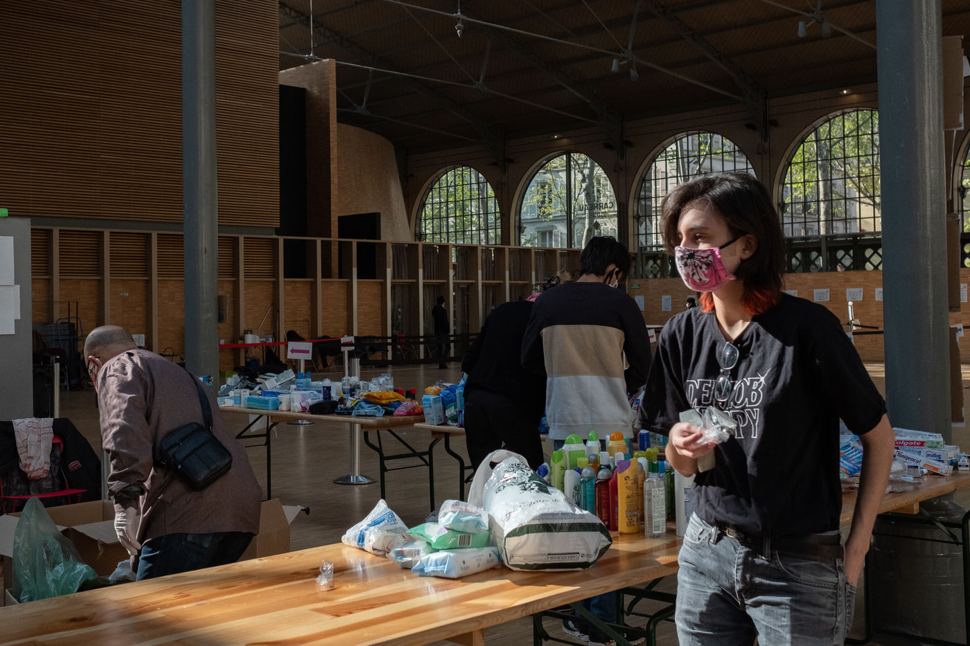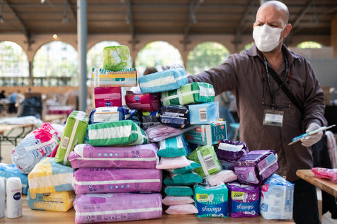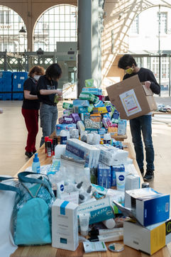Le Centre d'Action Sociale de la Ville de Paris dont La Fabrique de la solidarité avec le Samu Social, ont organisé une collecte de dons de produits d'hygiènes, de vêtements et d'aide alimentaire pour les sans abris. A l'appel de La Fabrique de la solidarité, Le jeudi 14 Avril est organisé la fabrication de ces kits avec des parisiens volontaires au Carré des Blancs Manteaux, réquisitionné par la ville pendant la crise sanitaire pour l'aide aux personnes en grande précarité.