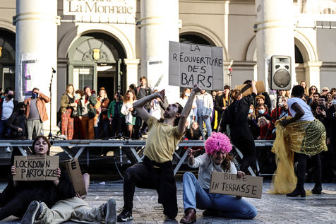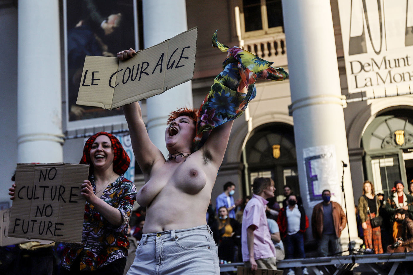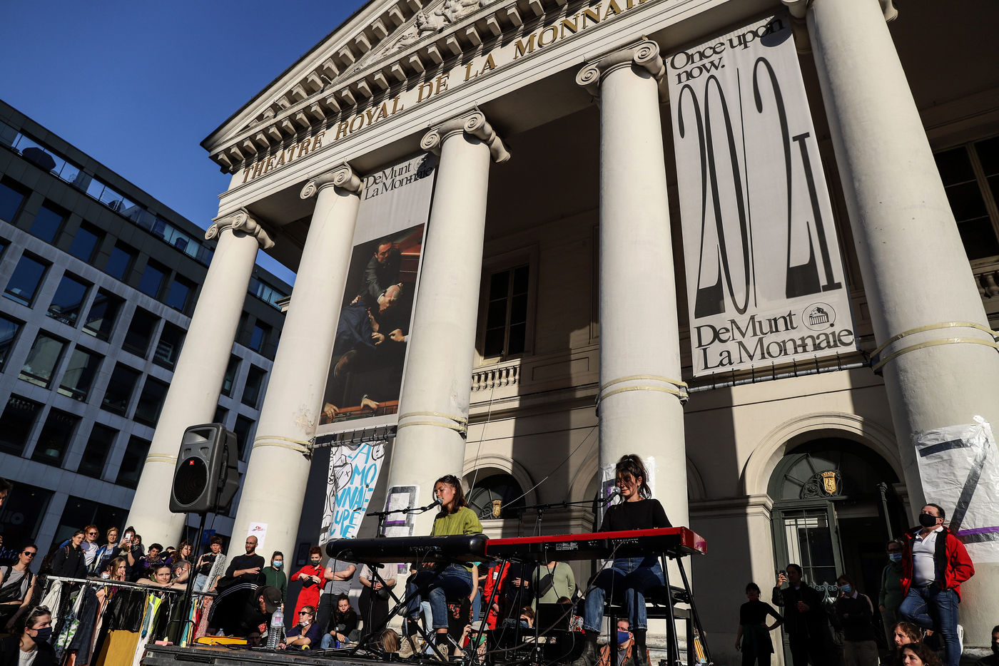 Last day of occupation of La Monnaie theater in Brussels. The police intervened to evict the occupants. The theater was occupied on April 3, 2021 by a collective of artists, workers in the cultural sector and students to protest against the management of the health crisis by the federal government, in particular with regard to employees in the cultural and artistic sector and the hospitality industry.