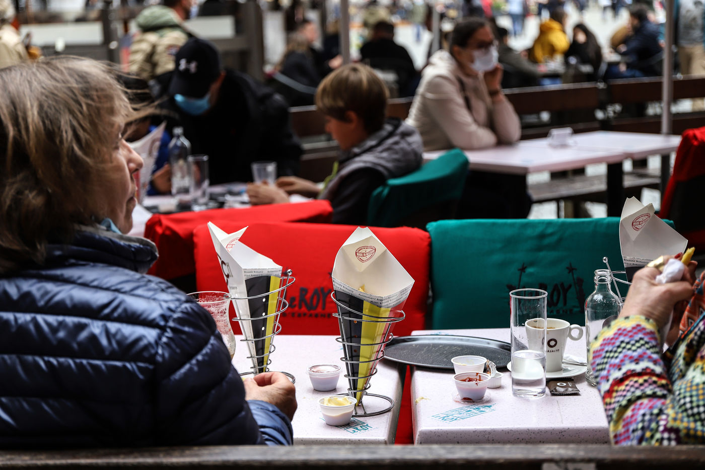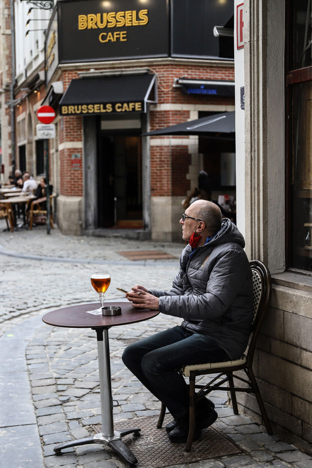 Les terrasses des bars en Belgique réouvrent apres une longue fermeture imposée par le gouvernement pour contenir la diffusion du Covid-19. Bruxelles, Belgique, 8 Mai 2021.