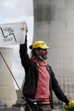 Environmentalist bikers demonstrate in front of Tihange nuclear plant. The demonstration is part of the Degaze tour, a 6-day biking tour linking 8 sites in Belgium where the construction of new gas power plants has been planned.