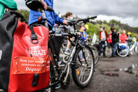 Un groupe d'écologistes en vélo manifestent devant la centrale nucléaire de Tihange en Belgique. La démonstration fait partie du tour Dégaze, un parcours vélo de 6 jours reliant 8 sites en Belgique où la construction de nouvelles centrales à gaz est en projet.