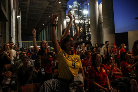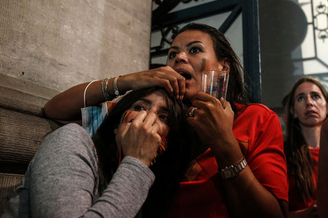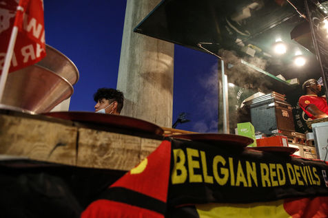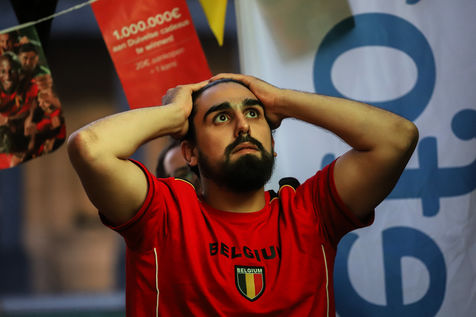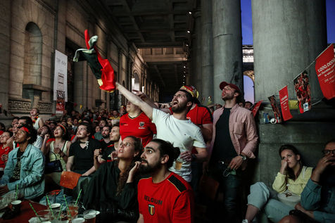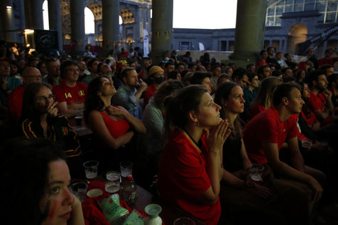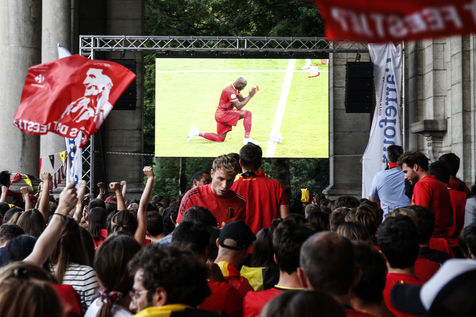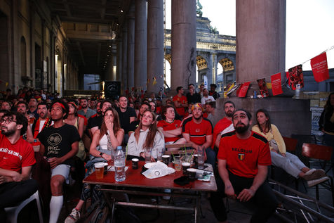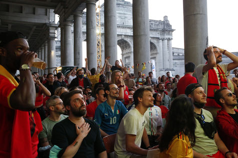 Belgian and Italian supporters watch the soccer match Euro 2020 Belgium-Italy at the Football Village of Cinquantenaire Park in Brussels. The match ended 2-1 for Italy. After the match, there were clashes between Belgian supporters and the police in the city center. Brussels, Belgium, July 2, 2021.