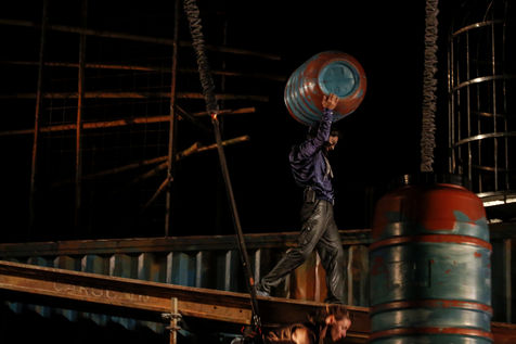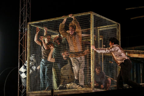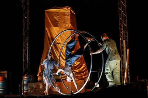 Artists of the contemporary circus company MagdaClan perform the show weLAND at the Tour&Taxis site in Brussels. The show represents the climate crisis and aims to engage the public in understanding the relationship between climate change and migration. After a tour in eight European countries, the last shows take place at the same time as COP26. Brussels, Belgium November 11, 2021.