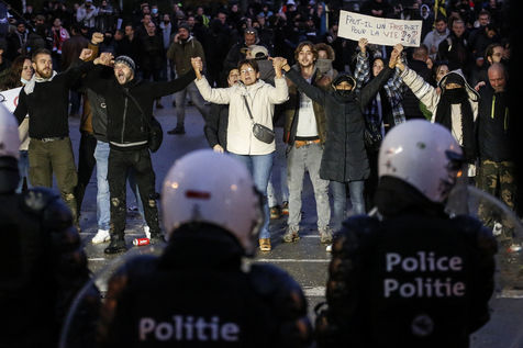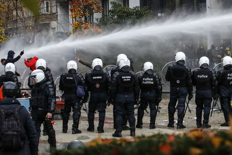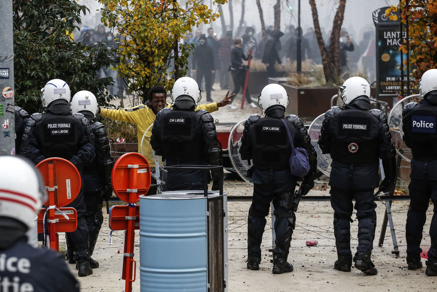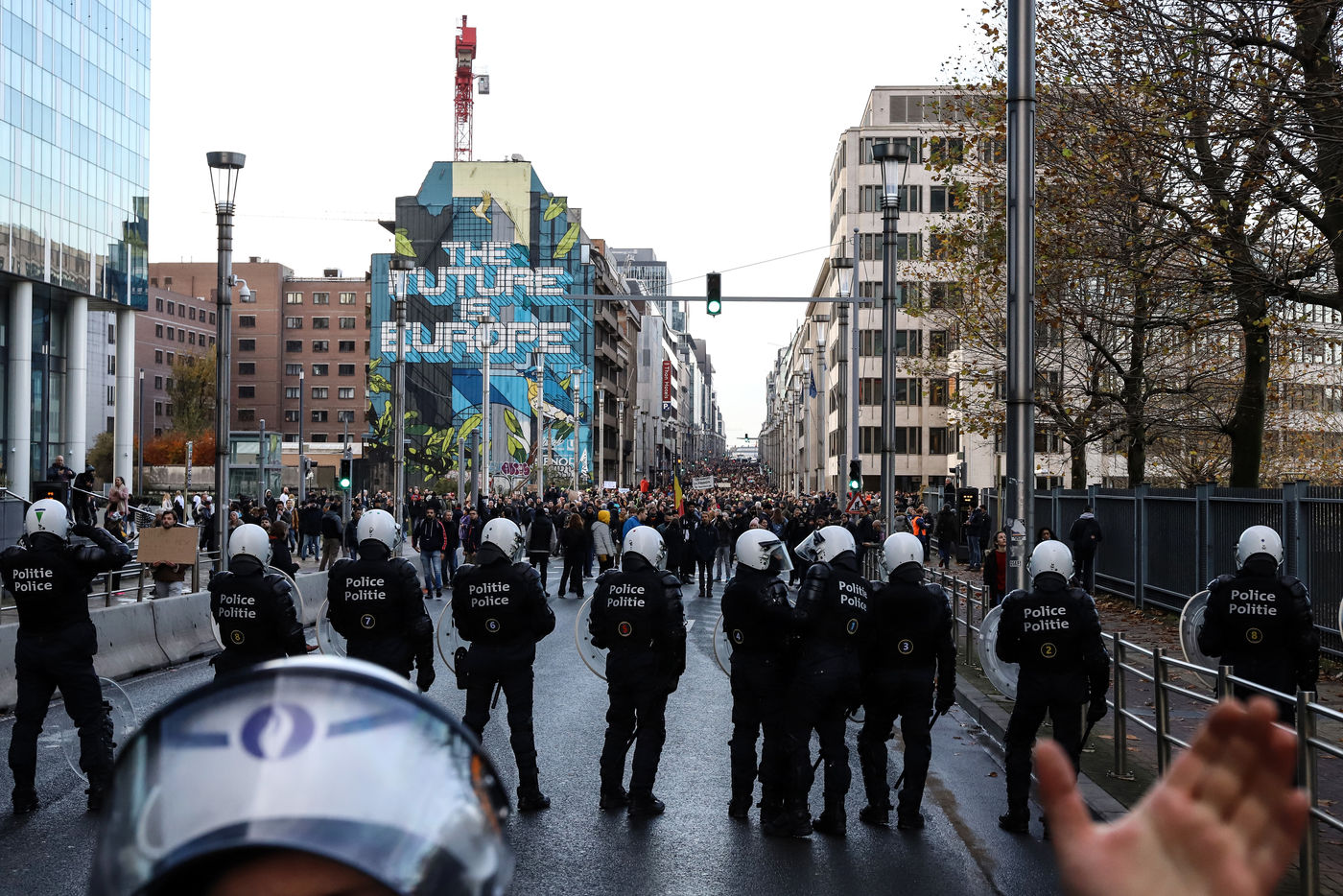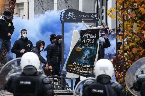Thousands of people demonstrate against the mandatory Covid safe ticket and other anti-Covid-19 measures in Brussels, Belgium on November 21, 2021. Protesters clashed with the police. 44 protesters have been arrested and three police officers have been injured.