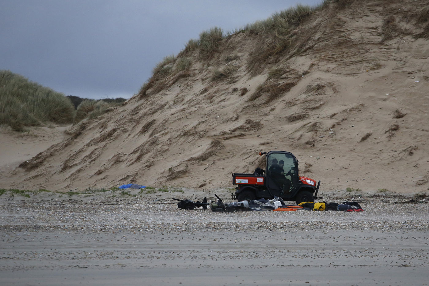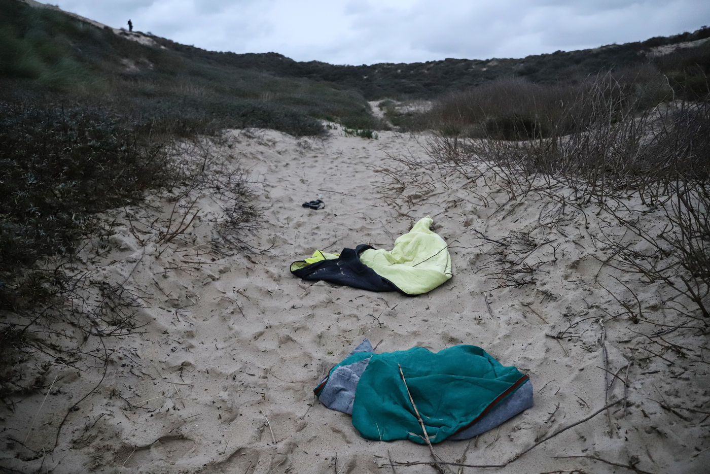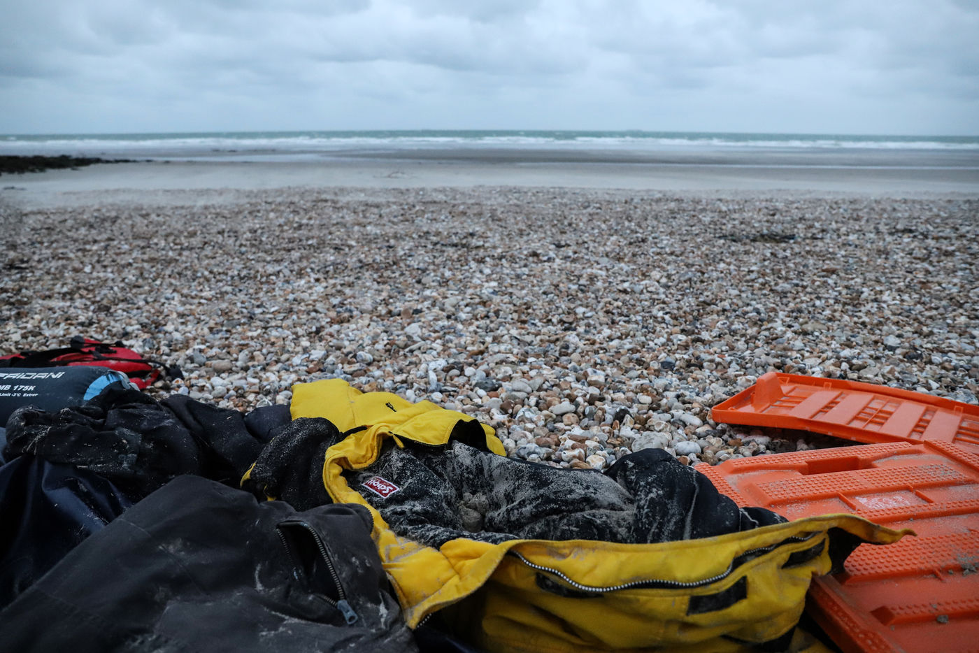 Life jackets, personal items, and a damaged inflatable boat are what remains of the passage of migrants trying to cross the Channel from Wimereux beach, near Dunkirk and Calais, in northern France. Wimereux, France, November 26, 2021. On November 24, 2021, 27 migrants died when their small boat sank while attempting to cross the Channel. The area is a natural reserve, and the absence of a politics of safe transit for migrants also creates issues at the environmental level.