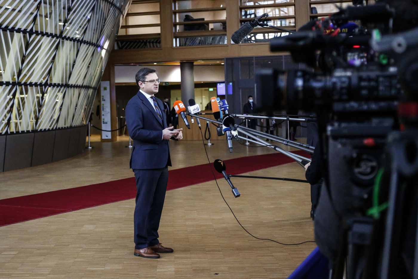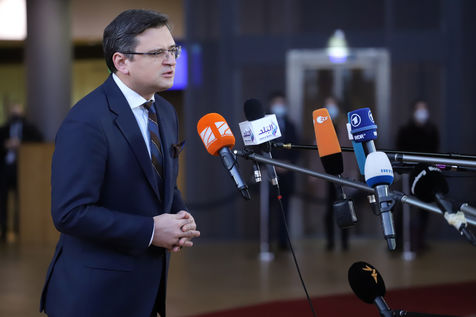 Foreign Ministers of the European Union discuss the ukrainian crisis during the Foreign Affairs Council at the European Council headquarters in Brussels, Belgium, February 21, 2022. Ukrainian Foreign Ministers participates in the meeting.