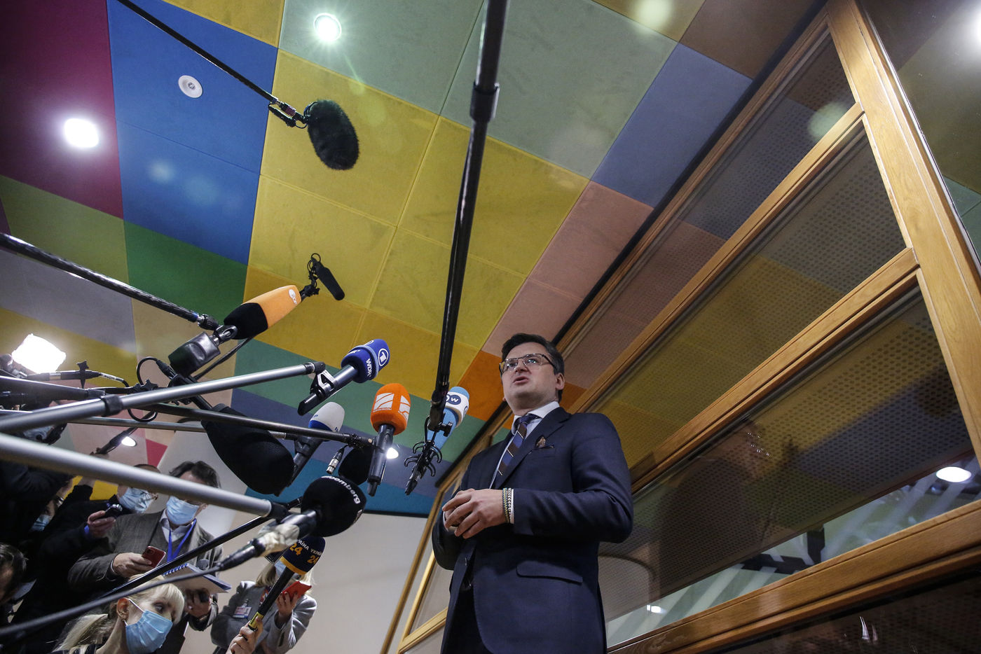 Les Ministres des Affaires Etrangères de l'UE discutent la crise ukrainienne pendant le Conseil des Affaires Etrangères au Conseil Européen de Bruxelles, Belgique, 21 Fevrier 2022. Le Ministre des Affaires Etrangères de l'Ukraine participe à la réunion.
