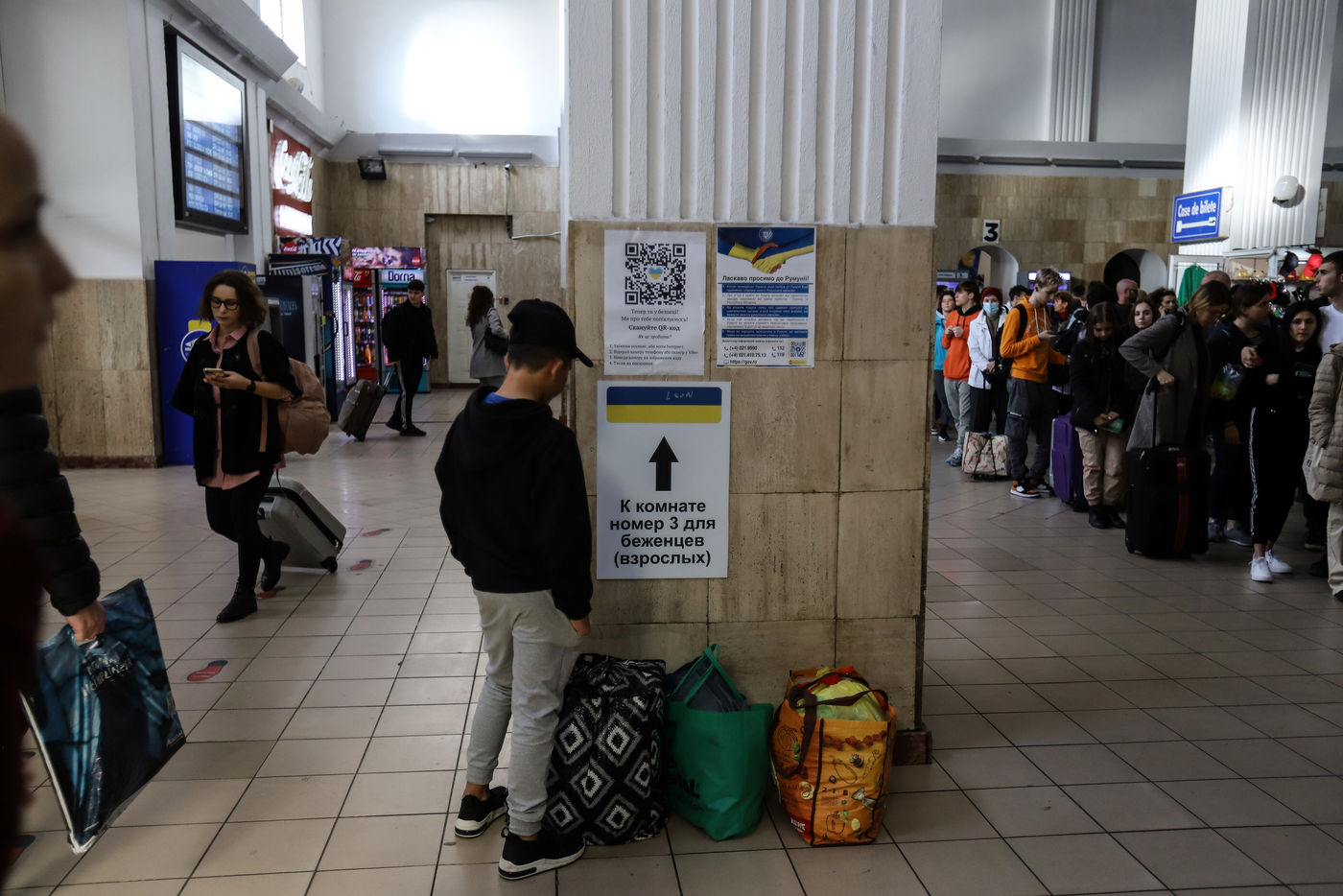 Bucharest, Romania, 2022/04/21. Displaced Ukrainians in waiting rooms at Bucharest train station. More than 690,000 Ukrainian refugees have fled to Romania so far and the country is preparing for more to come.