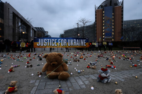 Belgium, Brussels, 2023/02/23. Demonstration organized by the NGO Avaaz near the European institutions on the occasion of the first anniversary of the Russian invasion of Ukraine. The demonstration is meant to bring to attention the reported claim of abduction of Ukrainian children by Russia.