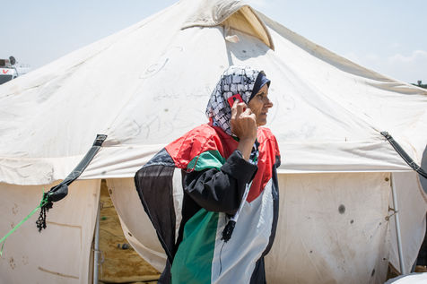 ) de 8h à 20h. Ici, je fais de mon mieux pour prendre soin et aider les Shebab (jeunes hommes) dans leurs différentes activités pour atteindre la barrière entre Israel et Gaza. Ils ont besoin d'une femme pour les protéger des soldats israéliens », explique Oum Wissam. Les shebab sont le groupe de jeunes hommes qui tentent d'atteindre et de franchir la barrière entre Israël et Gaza, un geste symbolique pour leurs droits de retour sur leur terre. Mais pas sans risques; Le 14 mai, des soldats israéliens ont tué au moins 52 Palestiniens et en ont blessé plus d'un millier, les manifestations coïncidaient avec l'ouverture controversée de l'ambassade des États-Unis à Jérusalem. Considérée comme «la mère du camp de Malaka», Oum Wissam prend soin de tous les Shebab en préparant le thé, en trouvant de la nourriture mais aussi en prenant part aux actions telles que trouver et brûler des pneus pendant les manifestations du vendredi. "J