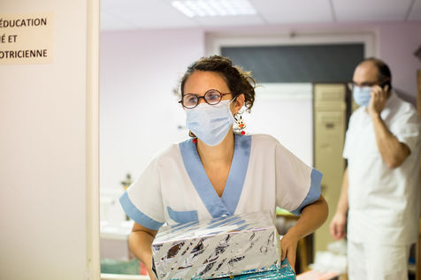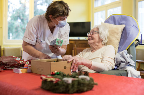 Christmas celebrations at the EHPAD de Saint-Sulpice in Villerest (France) in the midst of the health crisis at Covid-19. Despite the strict health constraints, the staff organise themselves to celebrate the end-of-year festivities with the residents. As a gesture of solidarity, pupils and parents from a neighbouring secondary school prepared gifts for the elderly.