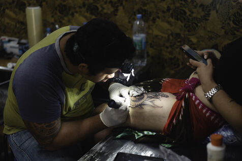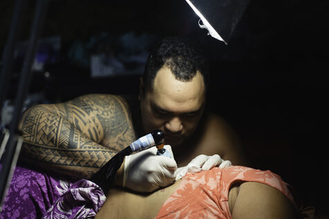 Faa'a nui a tu te tatau is an annual tattoo festival that takes place at the town hall of Faa'a, the most populated commune in Tahiti. This festival aims to highlight young tattoo artists. On the last day of this 2023 edition, they competed on the theme of custom, a rather free theme allowing to link traditional Polynesian tattooing to various inspirations. The tattooed people are called "support", the one that allows the tattoo artist to express himself. The function surpassing the humanity of the person, their face become secondary.