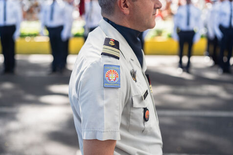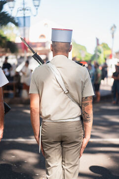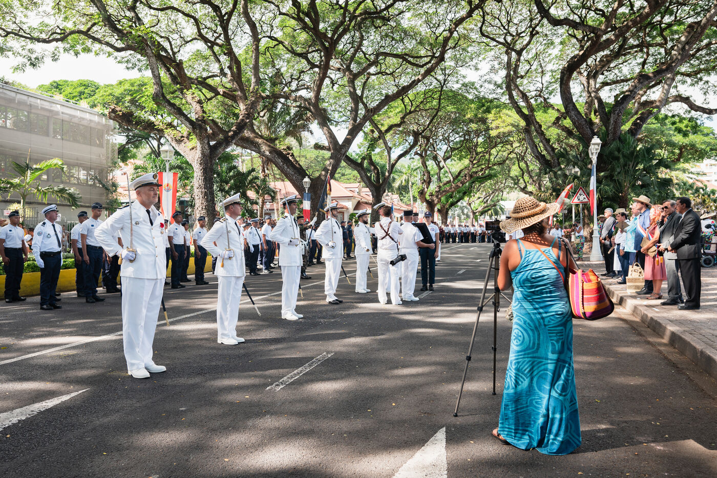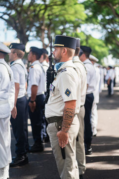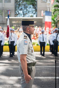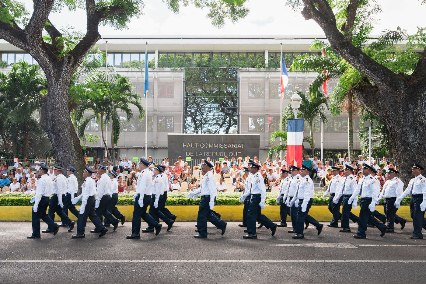 French Polynesia, 2023-07-14. The July 14th parade took place on avenue Pouvanaa in Oopa, between the French High Commission in French Polynesia and the Monument aux morts. The French armed forces present in the territory and a delegation from the Peruvian navy, on a stopover in Papeete, paraded in front of the officials present: High Commissioner Eric Spitz, President of French Polynesia Moetai Brotherson, President of the Assembly of French Polynesia Antony Geros, deputies to the National Assembly Steve Chailloux, Tematai Le Gayic and Mereana Reid Arbelot, and CESEC representatives Tu Yan and Eugene Sommers. The image shows officers of the Direction territoriale de la police nationale standing motionless in front of the High Commission building. Photograph by Vaikehu Shan / Hans Lucas.