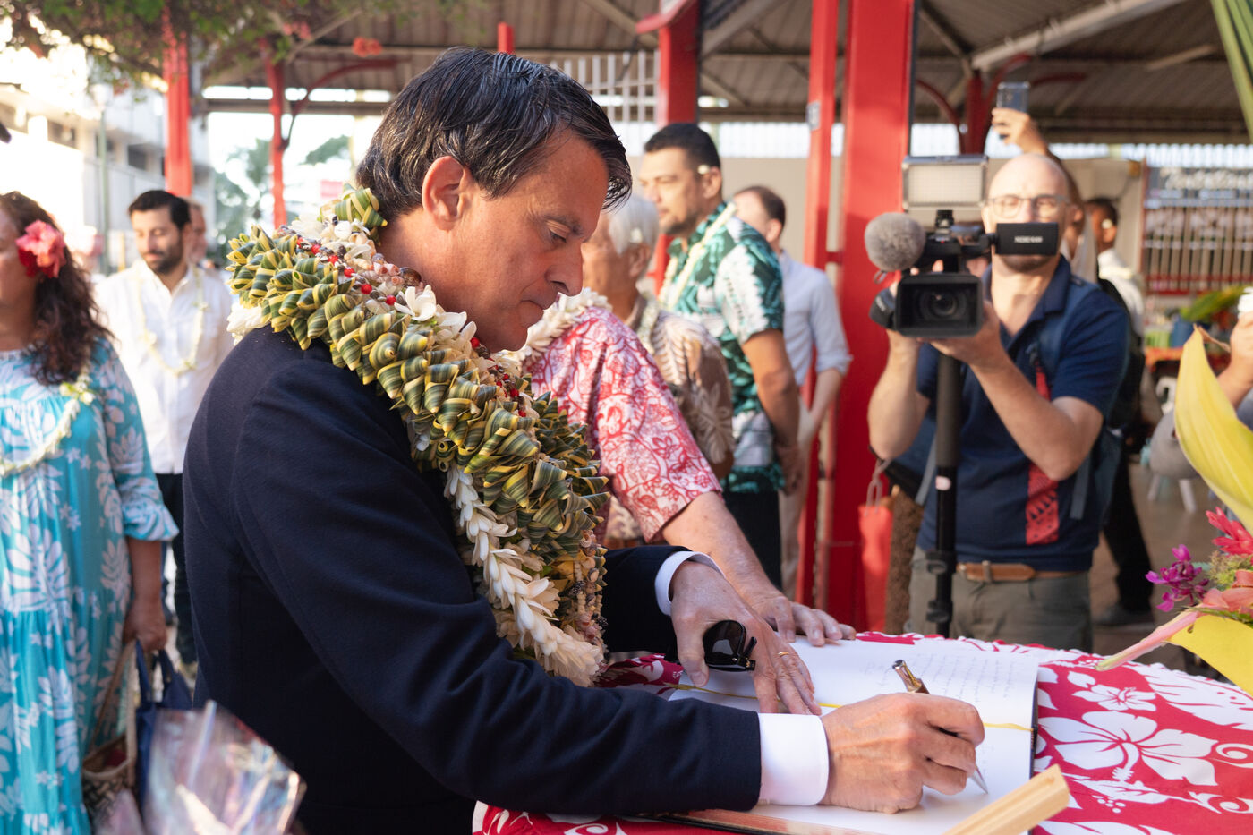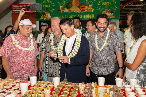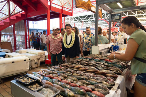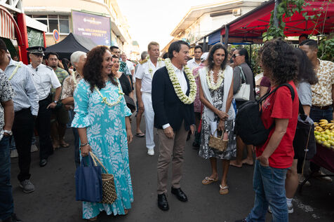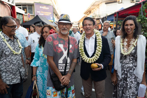 Le Ministre des Outre-Mer Manuel Valls visite le marché de Papeete un dimanche matin, et ses exposants de fruits, légumes, poissons, d'artisanat.