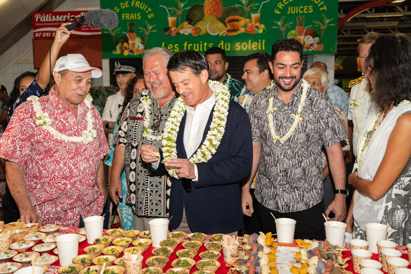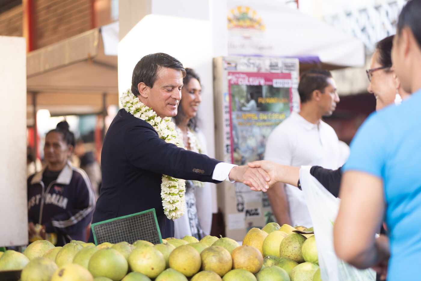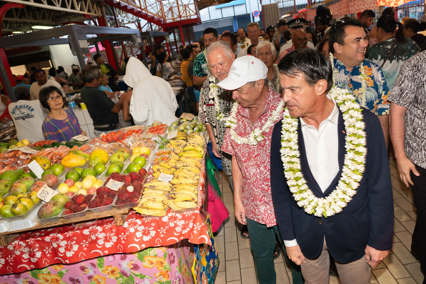 Manuel Valls, the French Minister of the Overseas Territories, visits the city market of Papeete on a Sunday morning and its exhibitors of fruits, vegetables, fish, craftsmen.