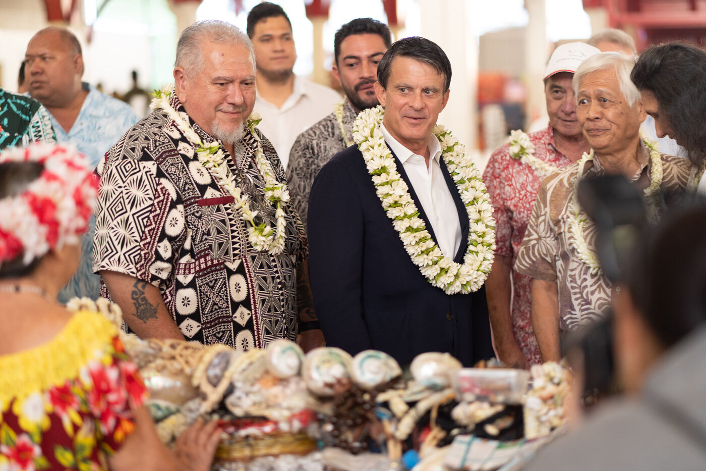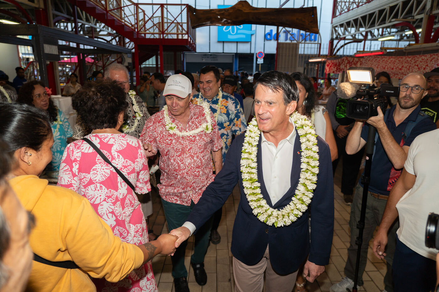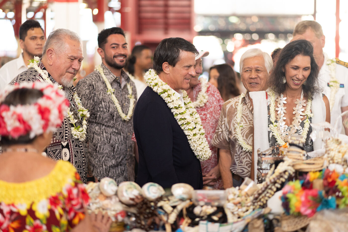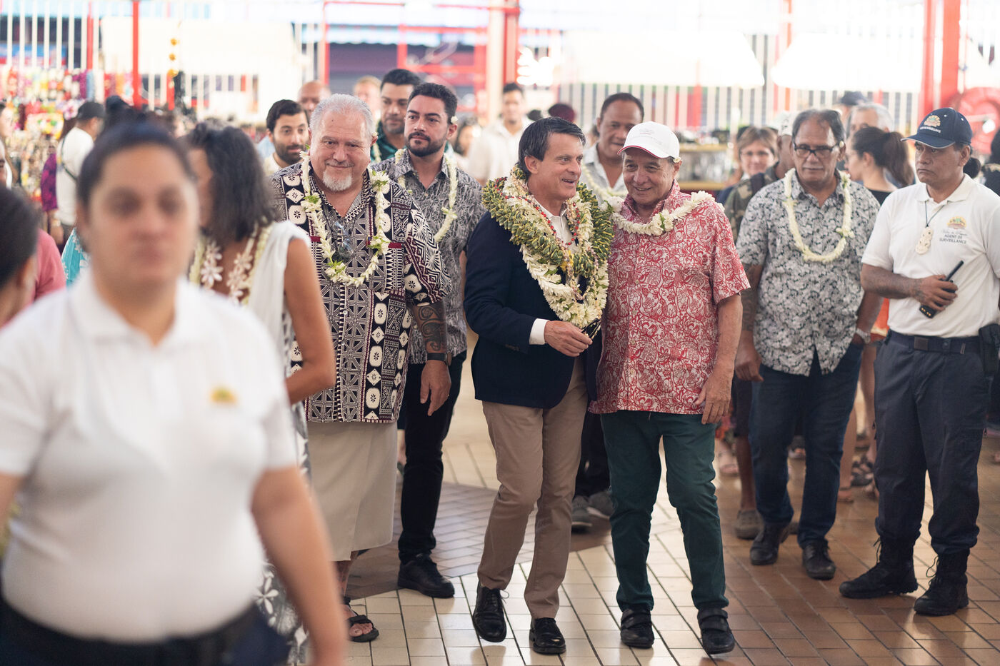 Manuel Valls, the French Minister of the Overseas Territories, visits the city market of Papeete on a Sunday morning and its exhibitors of fruits, vegetables, fish, craftsmen.