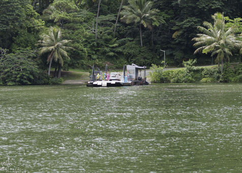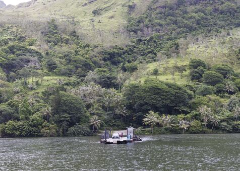 In eastern New Caledonia, the 34-kilometre-long Ouaième River has no bridges. To reach Pouébo in the north or Hienghène in the south, cars and pedestrians are forced to cross the river as there is no other road. The only way to cross this river is to take the last ferry of New Caledonia : the Ouaième ferry. According to local beliefs, the river is a path taken by the souls of the dead to the afterlife. This is why the site is taboo and no one has yet managed to replace the ferry with a bridge. A team of ferrymen, like Jérôme, take turns to provide a free crossing 24 hours a day, 7 days a week. The crossing takes 5 minutes, a journey through the lush vegetation of the Mont Panié massif, the highest peak of the frenche island at 1,629 metres.