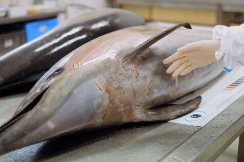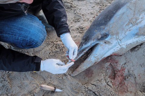 Les correspondants du Réseau National des Echouages, coordonné par l'observatoire et institut de recherche du CNRS Pelagis, se rendent tout au long de l'année auprès des animaux signalés par des promeneurs. Ils identifient l'espèce, documentent d'éventuelles traces de capture (hématomes, perforations, amputations...) et prélèvent parfois des organes, dont l'analyse permet de suivre l'état de santé des populations. Pour Pelagis, le taux de mortalité actuel des dauphins communs du golfe de Gascogne met en péril la population à l'échelle de quelques décennies. "Les dauphins viennent dans le golfe et ils y meurent", assure Hélène Peltier, chercheuse.