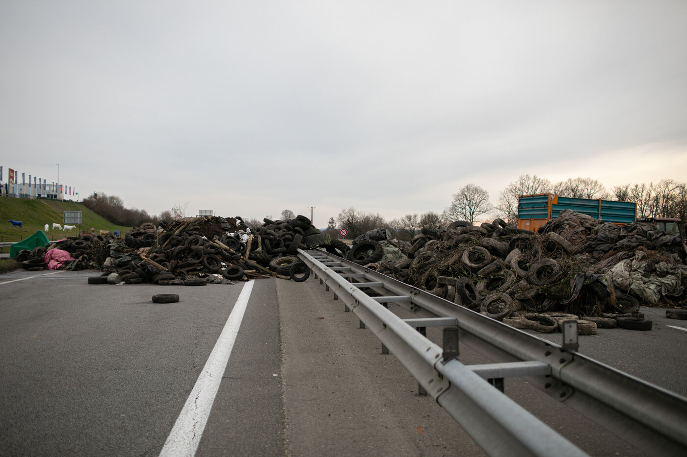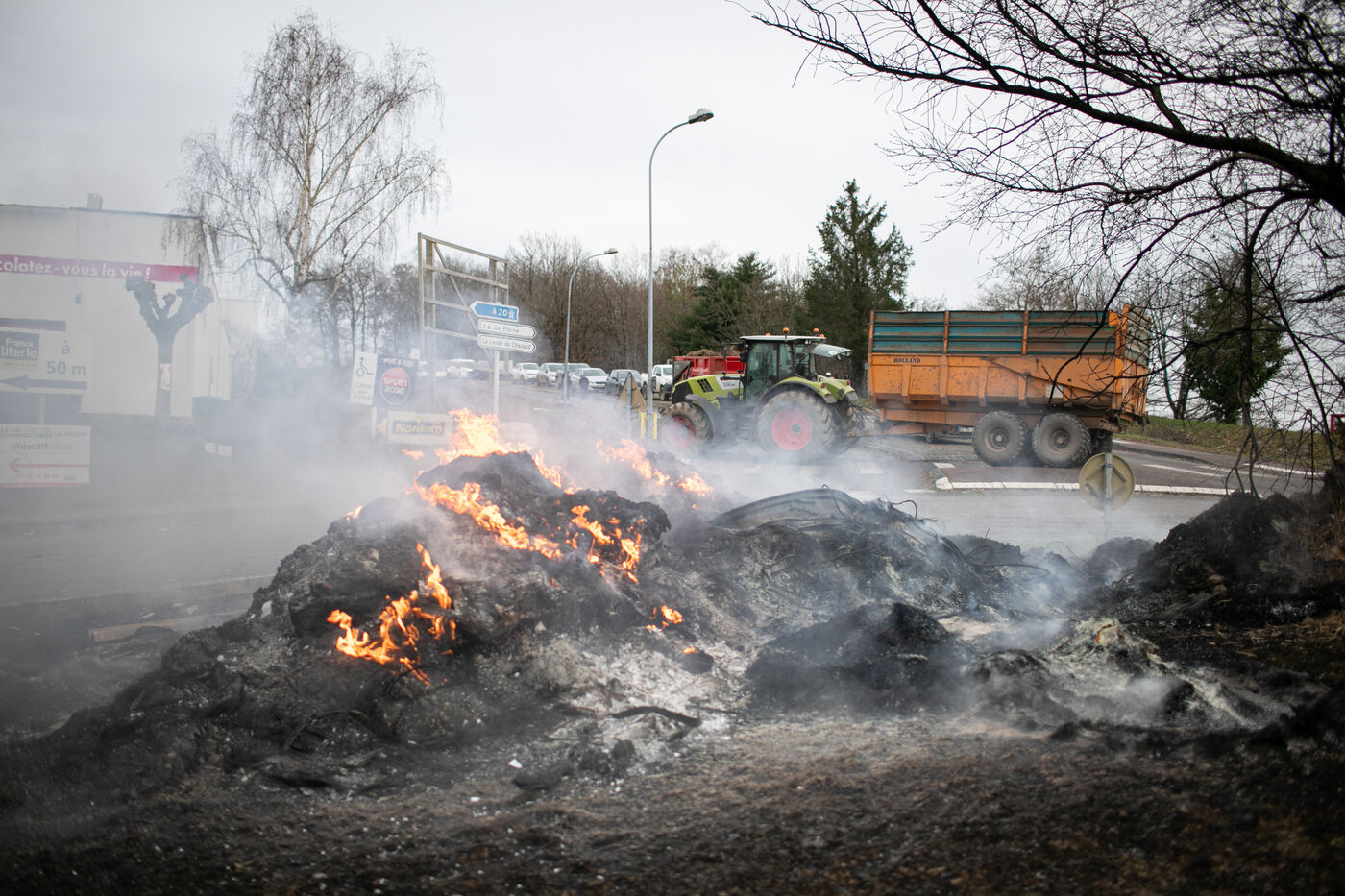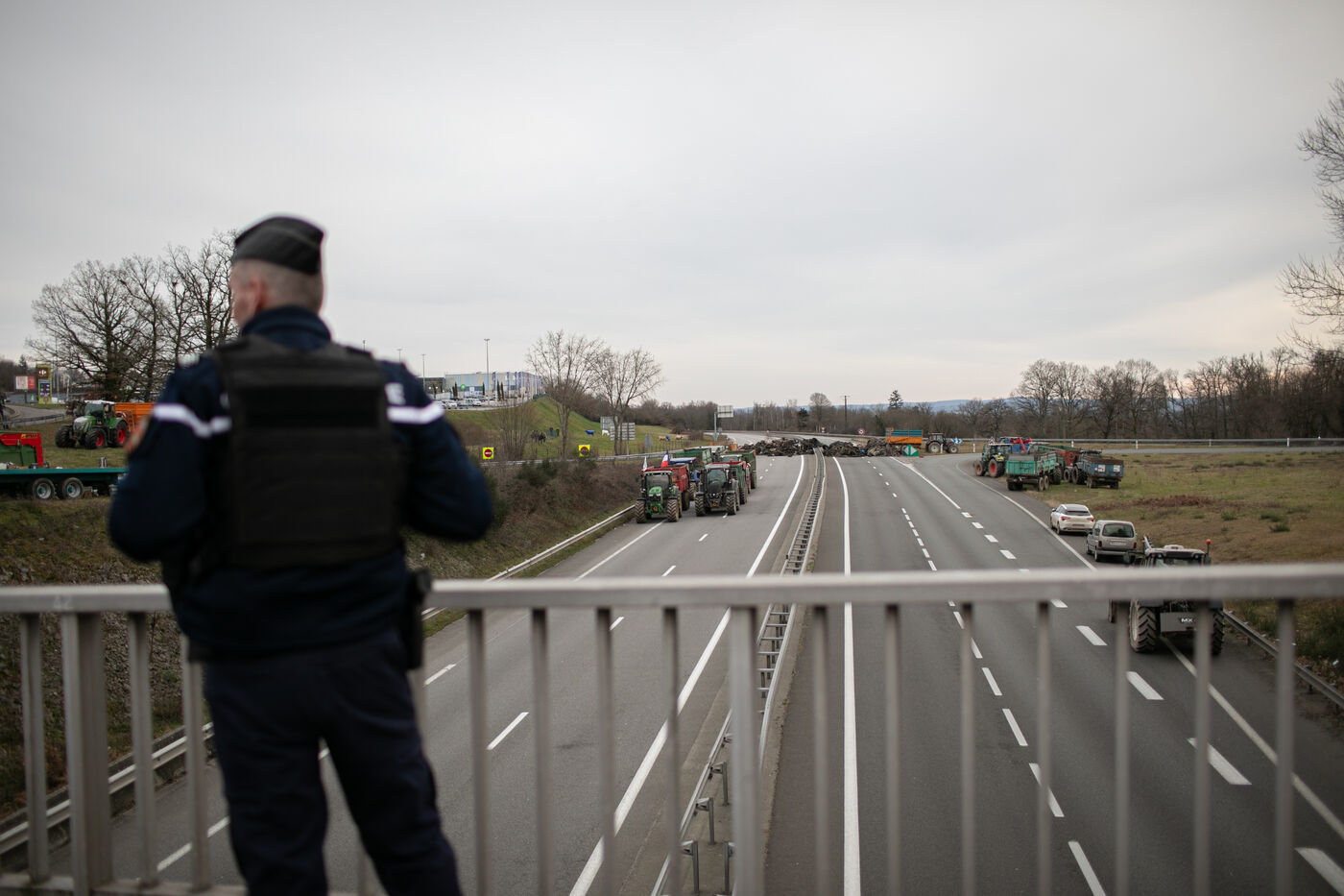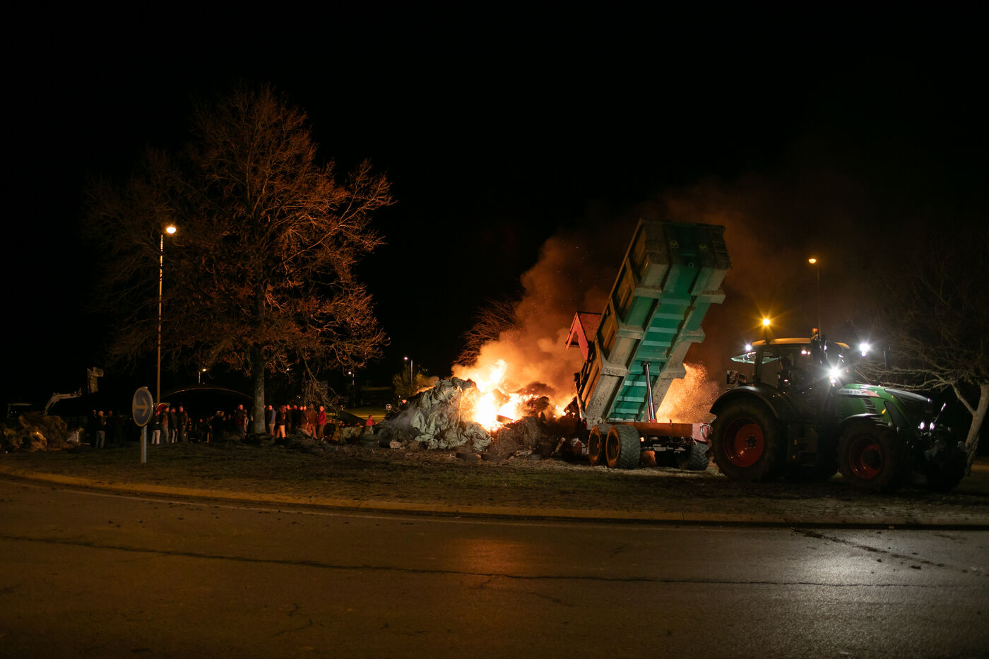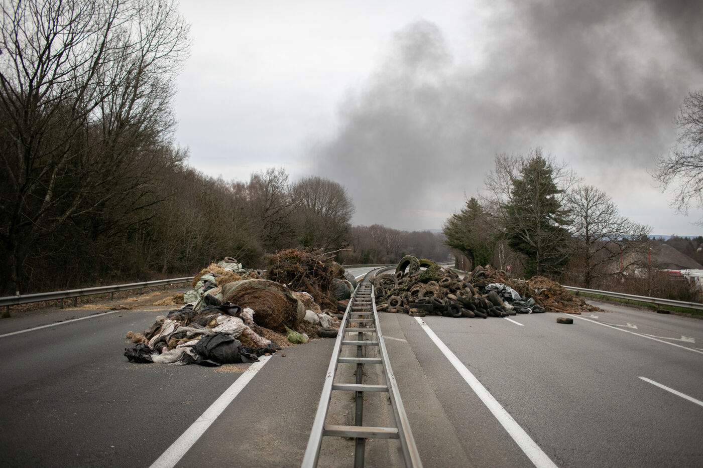 FRANCE, Limoges January 29, 2024, Blockade of the A20 at Boisseuil in Limoges' southern commercial zone. The FNSEA and Jeunes Agriculteurs unions called for a siege of Paris and a blockade of the main freeways from 2pm this Monday, after failing to get a satisfactory response from the government's announcements, for all farmers' unions. In particular, they are calling for a simplification of environmental standards, better remuneration and the introduction of levers to compensate for the taxation of non-road diesel fuel. Photography for Victoria Valdivia Trigo / Hans Lucas.