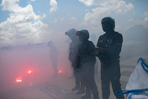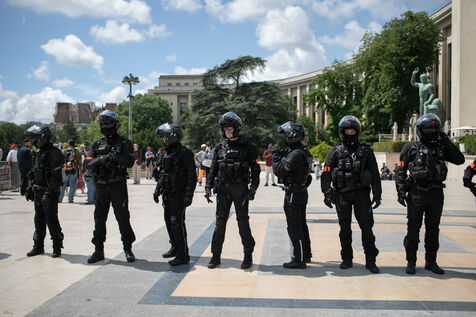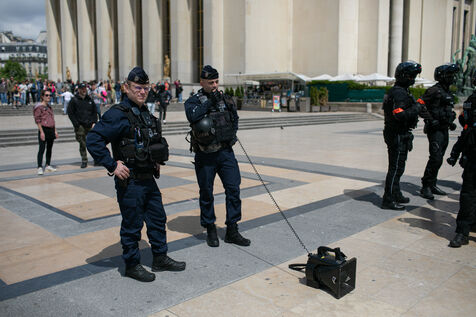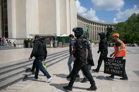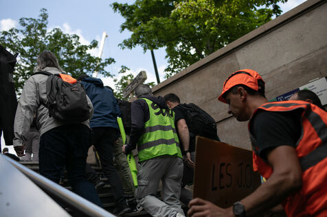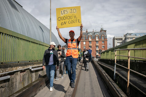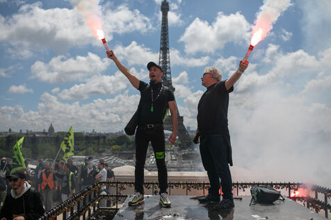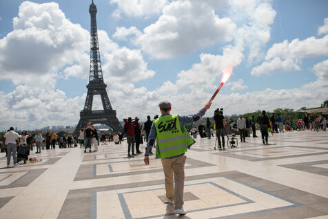FRANCE, Paris 21 mai 2024, action by railway workers on strike in front of the Eiffel Tower. Railway workers demand JO bonuses for those who will be working during the Olympic Games.