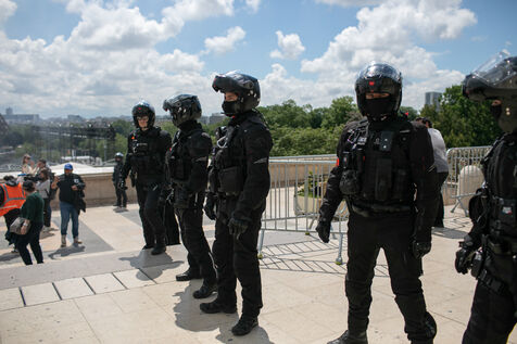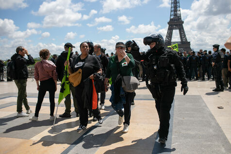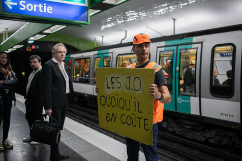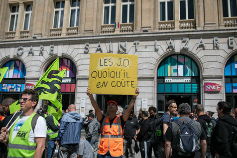 FRANCE, Paris 21 mai 2024, action des cheminots en grève devant la Tour Eiffel. Les cheminots réclament des primes JO pour ceux qui travailleront pendant les Jeux olympiques.