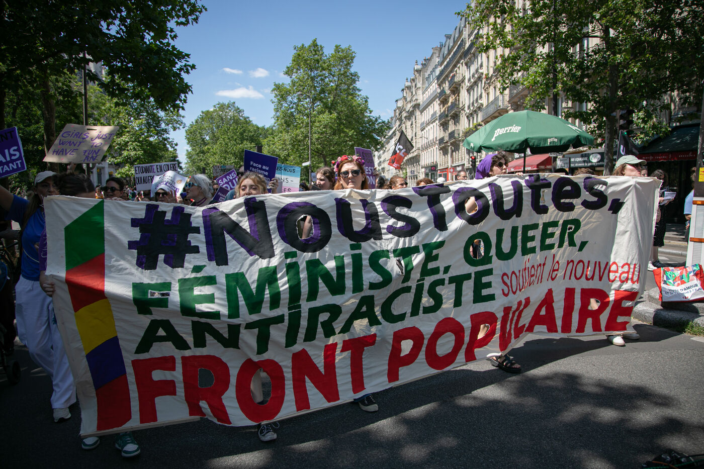 FRANCE, Paris 23 juin 2024, manifestation féministe contre l'extrême droite. Plusieurs associations, d'ONG et de syndicats ont défilé dans les rues de la capitale pour dénoncer le "féminisme de façade" utilisé par l'extrême droite. Photographie par Victoria Valdivia Trigo / Hans Lucas.