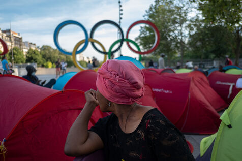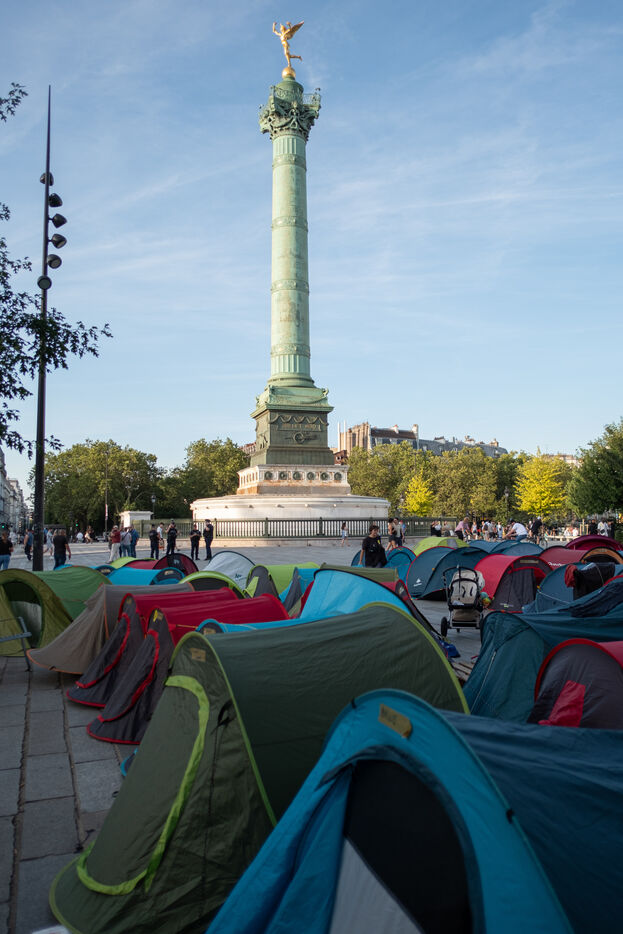 FRANCE, Paris 06 août 2024, installation d?un campement à Bastille, organise par les associations Droit au logement DAL et Utopia 56, pour demander l?hébergement des personnes sans-abri. Photographie par Victoria Valdivia Trigo / Hans Lucas.